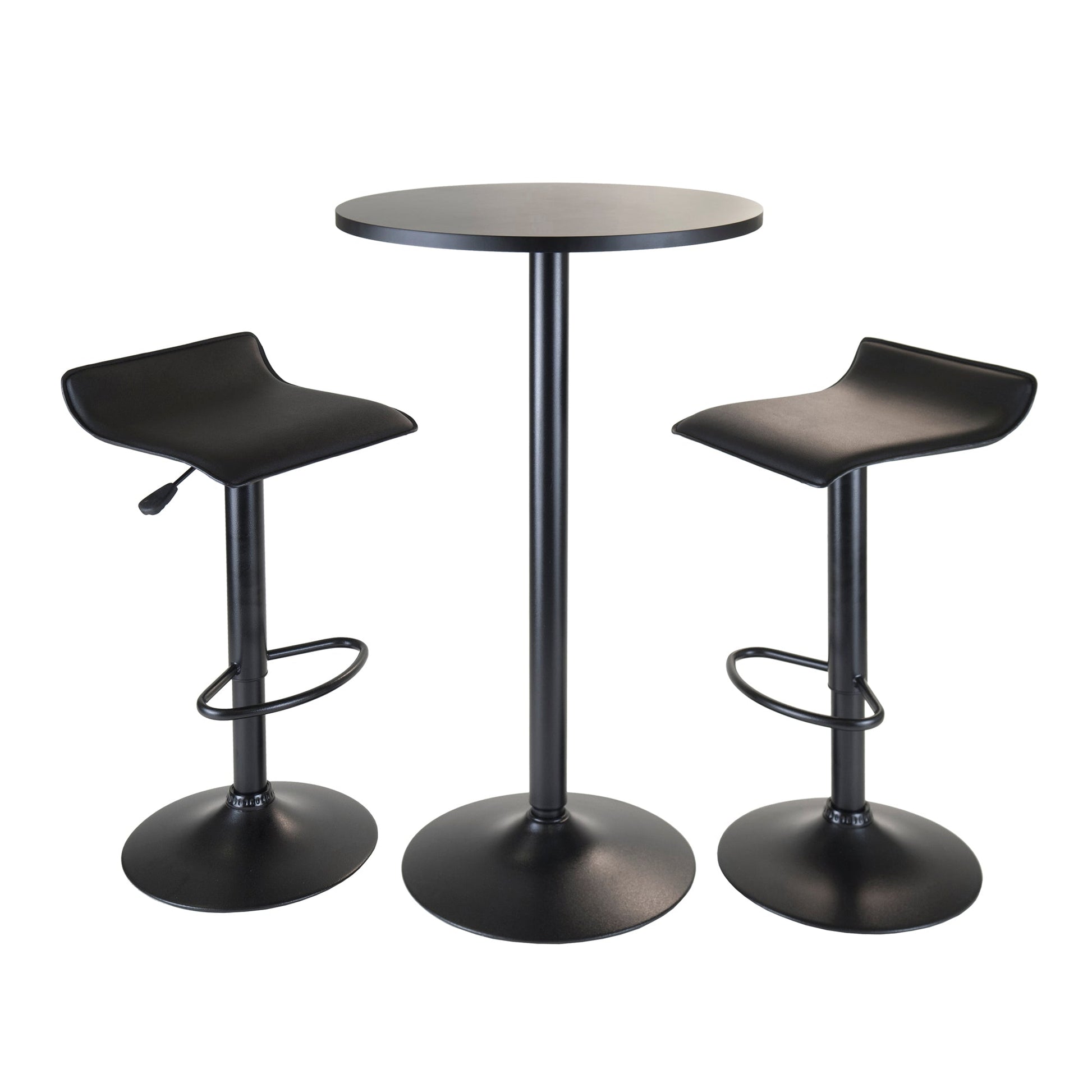 Give your home a new look with the Winsome Wood Obsidian 3-Piece Pub Set. Compact yet still sophisticated style of this set makes it a great addition to any area; ideal for dining or social gatherings. It has a sleek and modern design that will blend well with contemporary settings. With a diameter of 23.62”, the pub top is constructed of a smooth, sturdy wood composite tabletop with a black veneer, ample space to have a meal or snacks. This style and sophisticated look will make an excellent addition to any area of your house. So, whether in your kitchen or the basement bar the black coated pedestal is built for durability and the 17.52” base offers a tip-free, stable support that helps provide durability and sturdiness for long-lasting wear as well as maximum legroom. Featuring two adjustable swivel stools with black PVC seat and black metal base that swivel 360 degrees for extra utility. The backless design makes these convenient for storing away when adjusted to the lowest position. Your guests can have their seat at their preferred height, raised up to 30.79” or easily lowered to 22.68” by just lifting the leveler on the side, making these suitable for all guest. With a 15” base that helps add sturdiness and foot bar providing that additional comfort while sitting. This set is shipped out in 2 boxes, each including the hardware necessary for assembly. Replacement part request can be submitted directly to the manufacturer within 60 days from date of purchase.Dimensions : 23.62 in. Wide 23.62 in. Deep 39.76 in. High