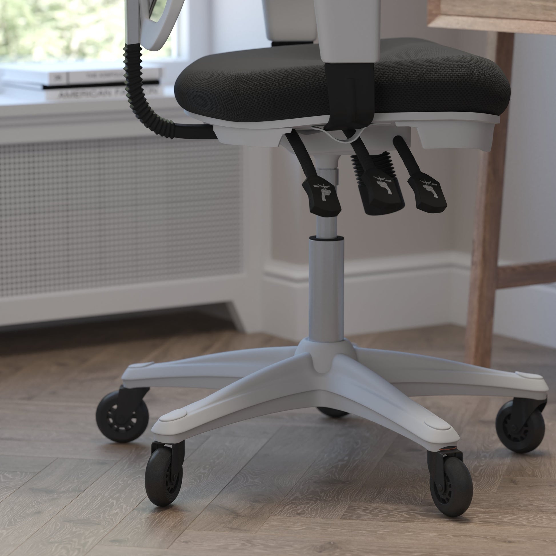 Equipped with smooth-rolling transparent roller wheels, this chair glides effortlessly across various surfaces, enhancing your mobility and efficiency. The sturdy white frame adds a modern touch, seamlessly blending with any office decor. With dimensions optimized for both home and professional environments, this chair is an ideal choice for anyone looking to enhance their productivity.