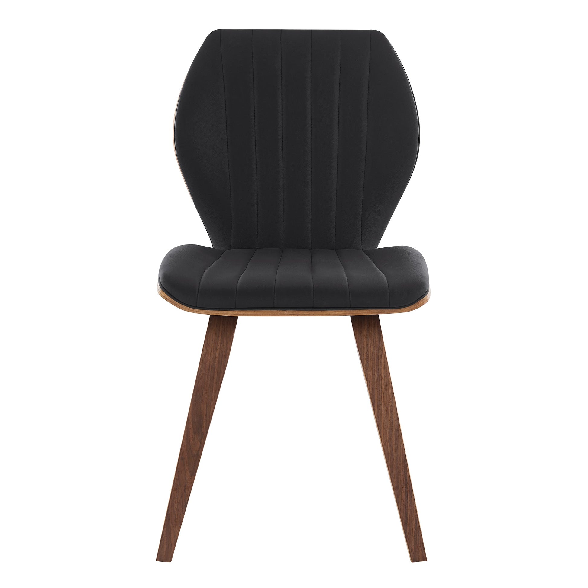 The Armen Living Ontario Black Faux Leather and Walnut Wood Dining Room Chair will bring a timeless contemporary appearance into your home. This dining chair were built with personality - modern sensibility is on full display with these dining chairs. The wide seat and ergonomic design is capable of keeping you comfortable and relaxed while you enjoy a meal at the dinner table. The vertical segmented stitches combine with the geometric shape of the chair - fulfilling the clean and sleek design of the Ontario. The Ontario is available in your color choice of Gray or cream faux leather with walnut wood or Gray faux leather with matte black wood. The Ontario dining chairs comes as a set of 2 and can support up to 250lbs per seat.