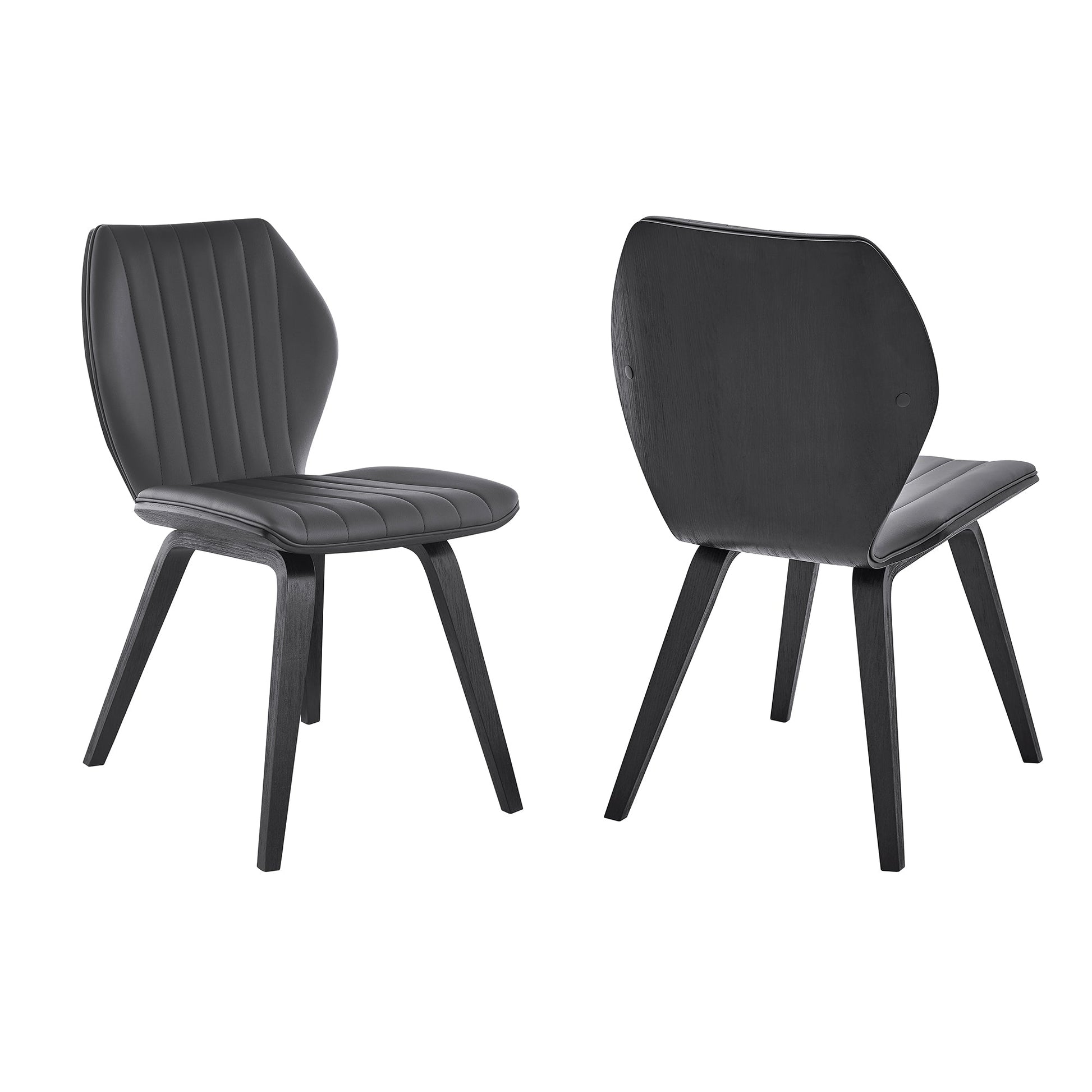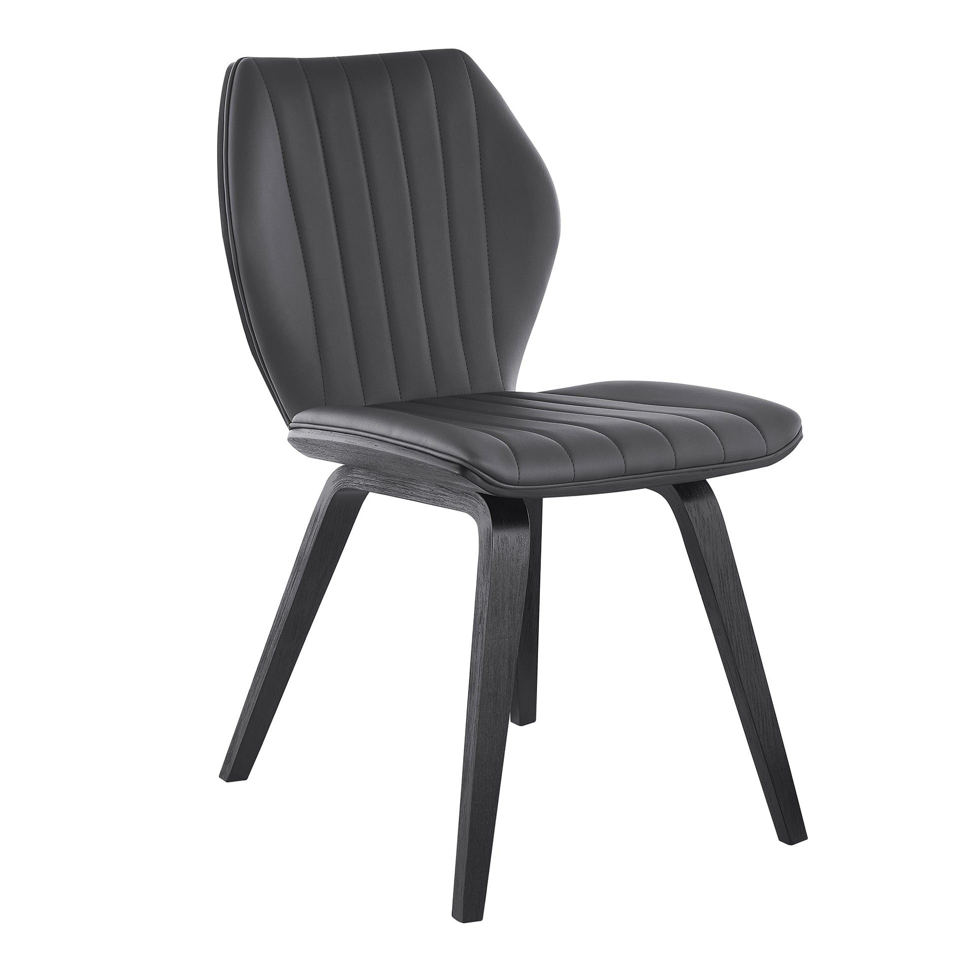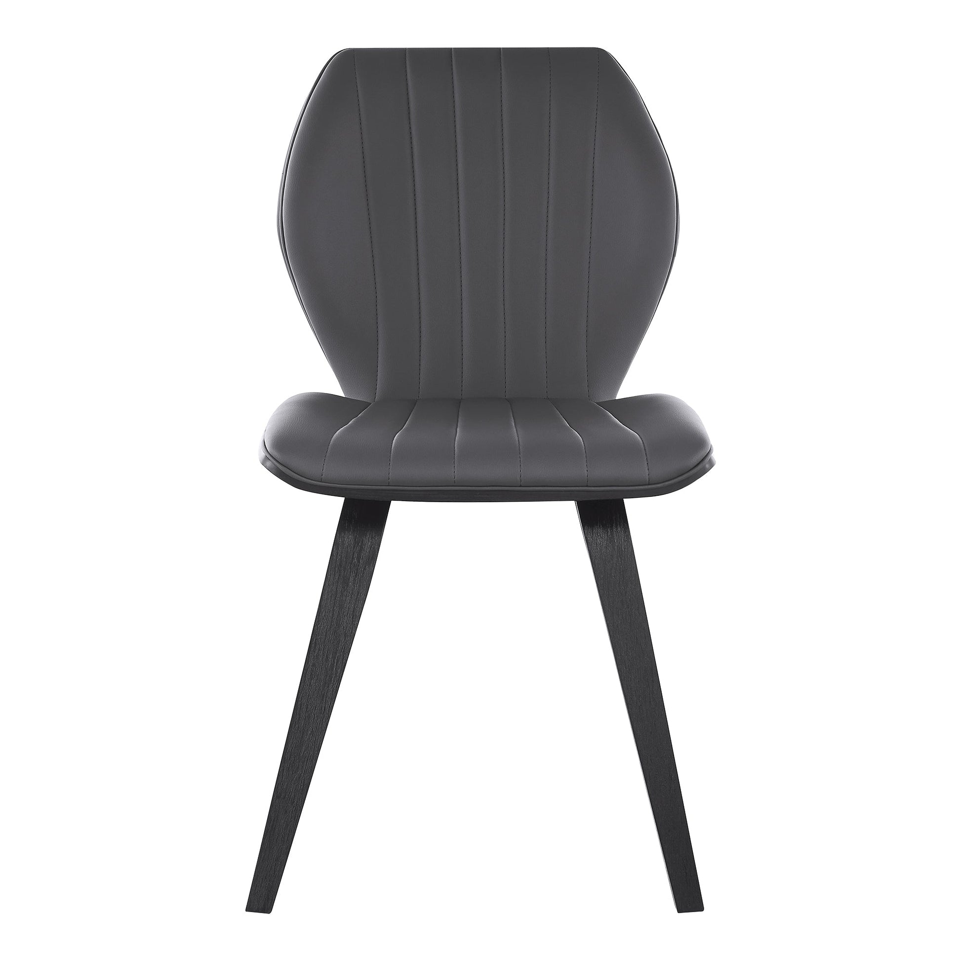 The Armen Living Ontario Gray Faux Leather and Black Wood Dining Room Chair will bring a timeless contemporary appearance into your home. This dining chair were built with personality - modern sensibility is on full display with these dining chairs. The wide seat and ergonomic design is capable of keeping you comfortable and relaxed while you enjoy a meal at the dinner table. The vertical segmented stitches combine with the geometric shape of the chair - fulfilling the clean and sleek design of the Ontario. The Ontario is available in your color choice of Gray or cream faux leather with walnut wood or Gray faux leather with matte black wood. The Ontario dining chairs comes as a set of 2 and can support up to 250lbs per seat.