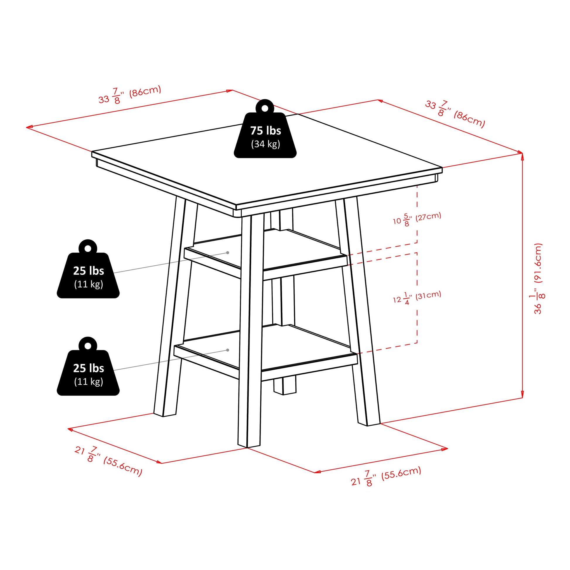 The 5-piece Orlando High Table and Ladder Back Stool Set combines simplicity and function, reminiscent of a country home antique. The set is a great addition to a dining area, eat-in kitchen, or family room for cards and board games. Or pull up one of the stools and use the table as a desk or workspace. The table features 2 shelves that offer generous storage space for dishes, glassware, and other dining accessories. The solid wood Ladder Back Stools give the set a warm and homey character. Finished in a rich Walnut, the table is made of solid and composite wood for long-lasting stability. Overall table size is 33.8"W x 33.8"D x 36"H.