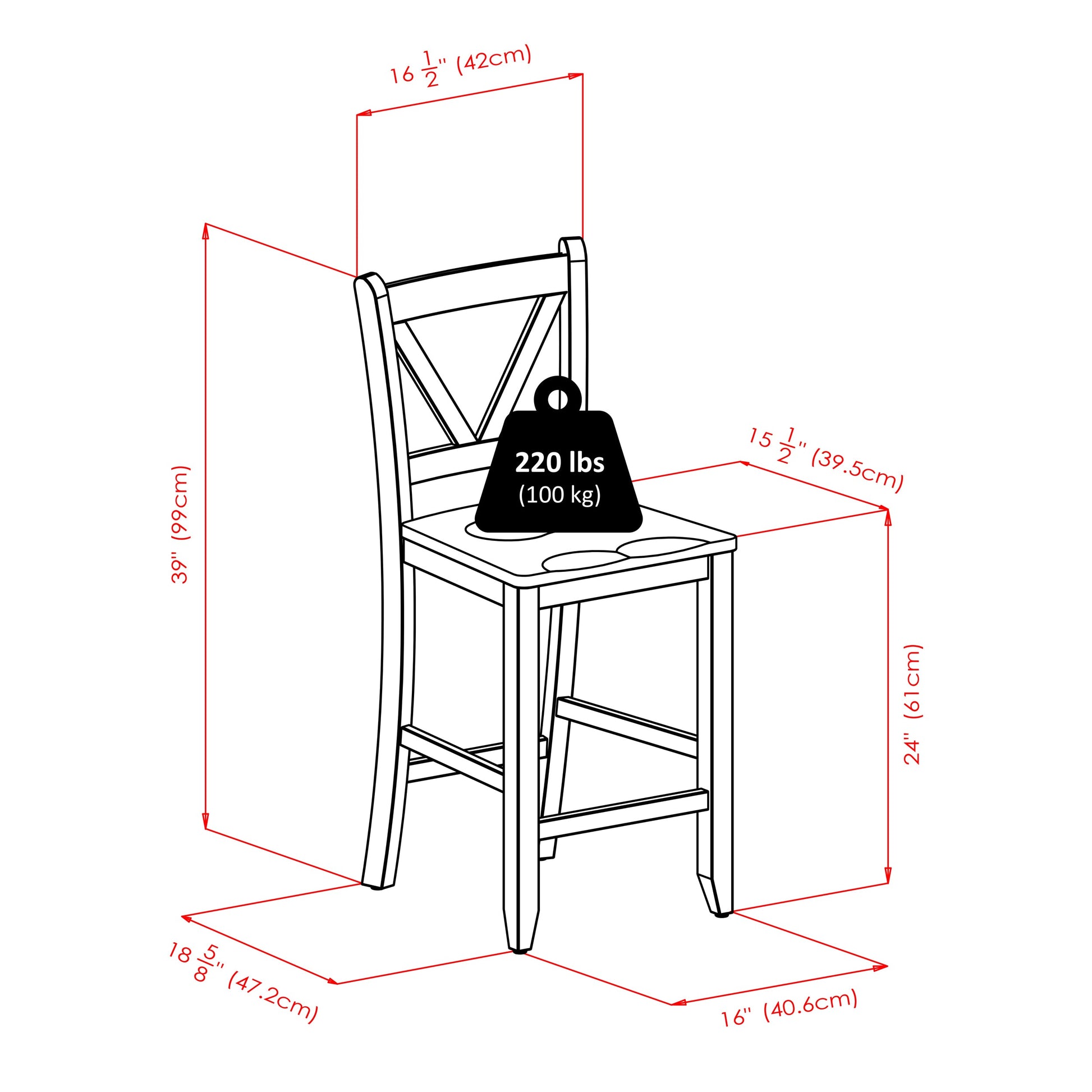 The 5-piece Orlando High Table and V-Back Stool Set combines simplicity and function, reminiscent of a country home antique. The set is a great addition to a dining area, eat-in kitchen, or family room for cards and board games. Or pull up one of the stools and use the table as a desk or workspace. The table features 2 shelves that offer generous storage space for dishes, glassware, and other dining accessories. The solid wood V-Back Stools add a splash of style to the set's warm and homey character. Finished in a rich Walnut, the table is made of solid and composite wood for long-lasting stability. Overall table size is 33.8"W x 33.8"D x 36"H.
