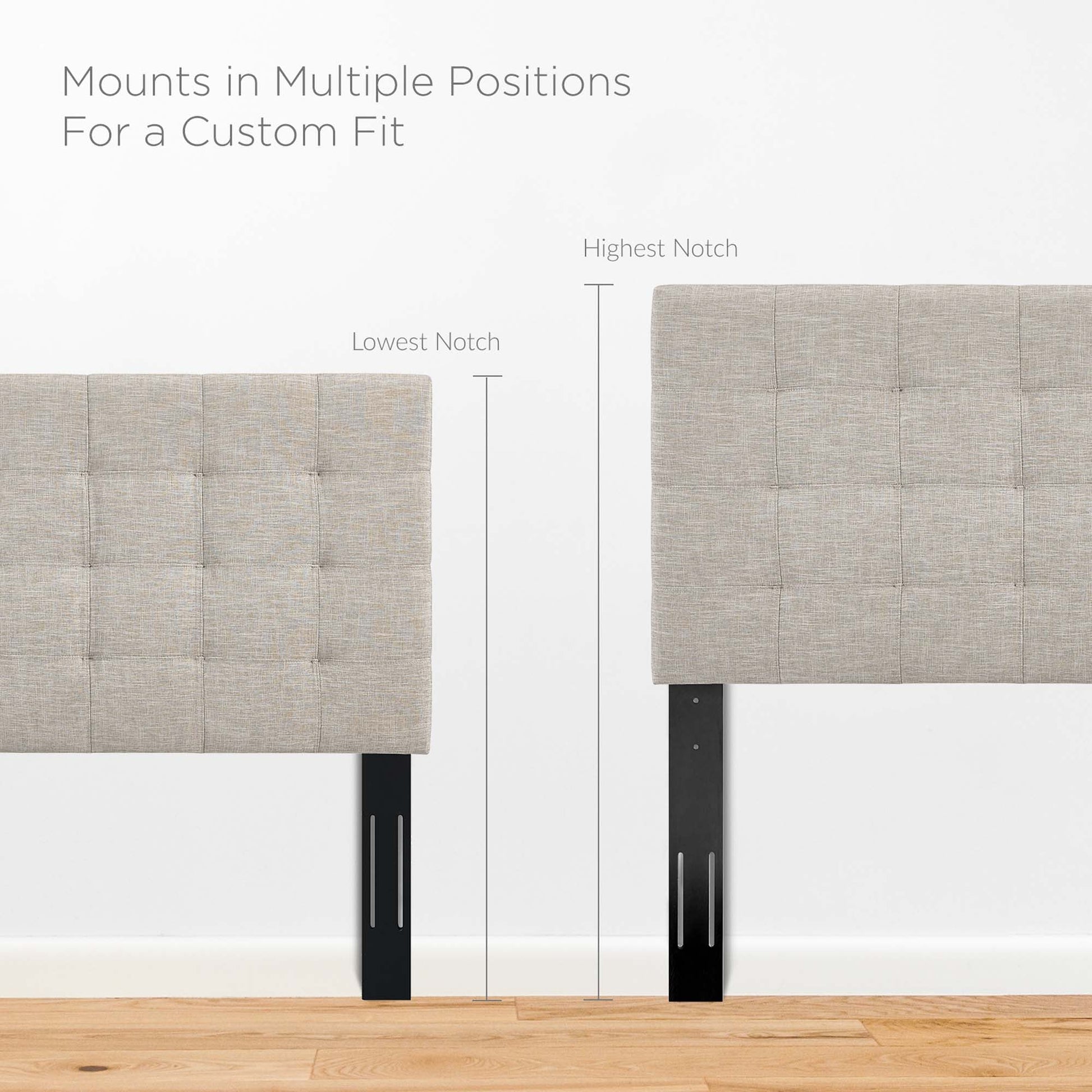 Enjoy simple elegance with the square-patterned design of Paisley. Featuring timeless biscuit tufting, Paisley updates the guest bedroom or master suite with charming appeal. A stylish king or Cali / California king headboard, Paisley is made of soft upholstered linen fabric covering a durable fiberboard and plywood frame with dense foam padding. Solidly constructed with extra wide black-stained wood post legs that fit either king or California king bed frames, choose from three mounting positions with this tall, padded headboard that ranges from 46 - 54 inches in height. The Paisley king or Cali / California king headboard is a lavish addition that offers quality support while reclining and relaxing. Overall Product Dimensions: 3"L x 79.5"W x 46 - 54"H