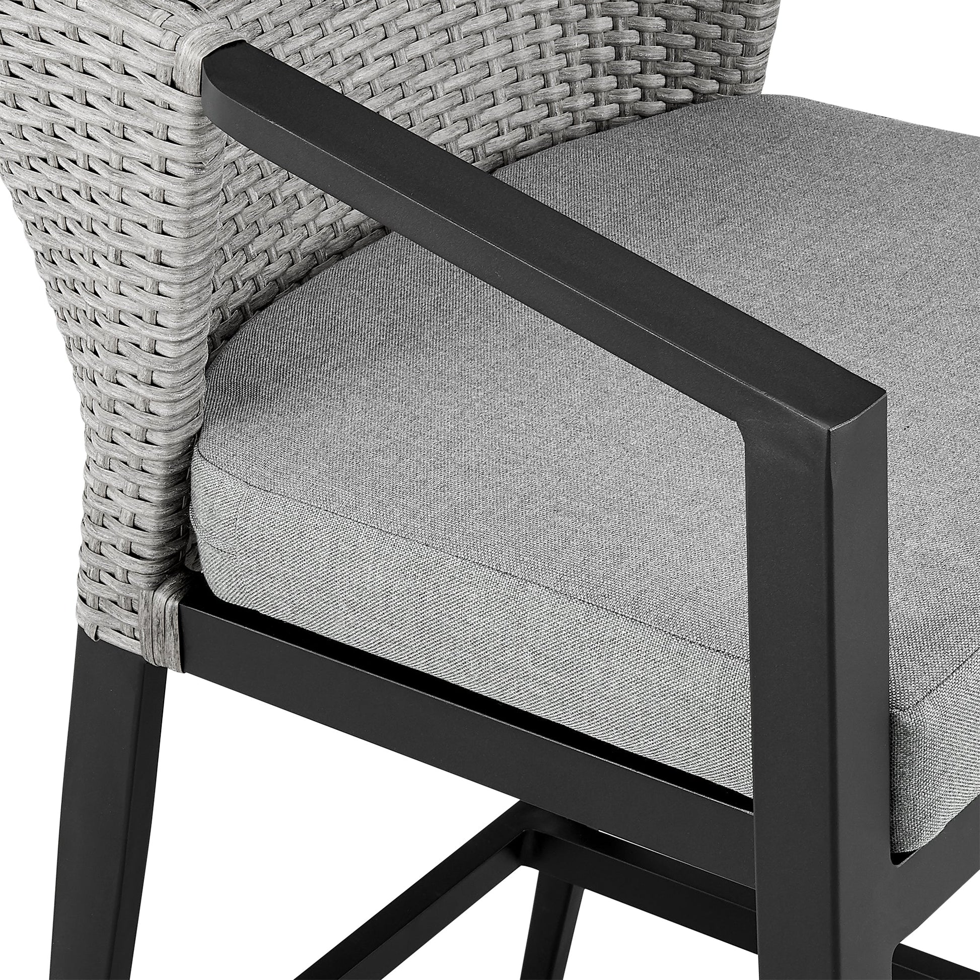 Designed with a subtly curving back and angular arms, this bar stool offers exceptional support and comfort. The lightweight aluminum framework makes it easy to move, while the multi-layer powder coating provides robust protection against UV rays, water, rust, and everyday wear and tear, ensuring longevity for both indoor and outdoor use. The high-density foam cushions, covered in dark gray fabric, not only enhance seating comfort but also feature a convenient zipper closure for effortless removal and cleaning.