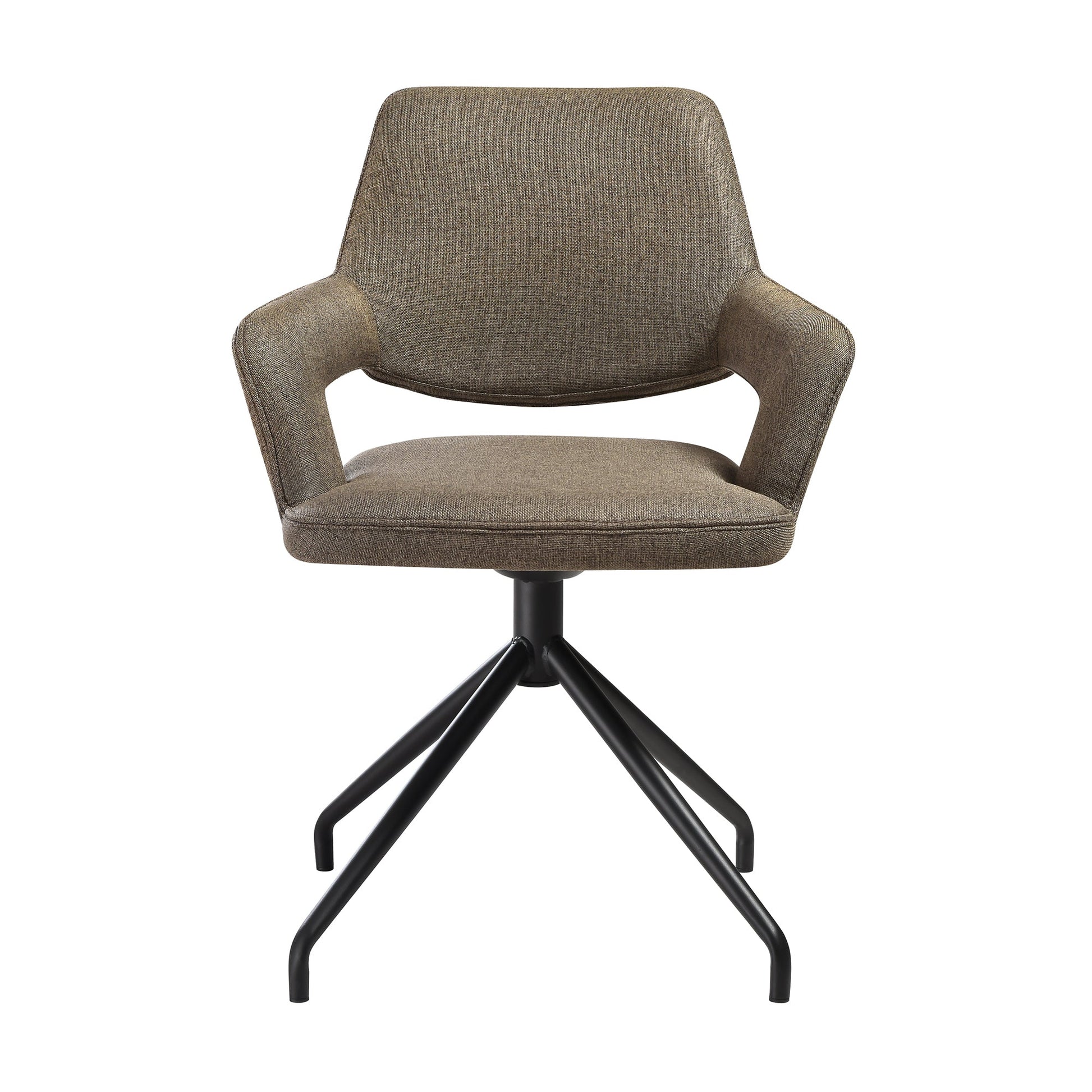 Update your dining space with the elevated style and functionality of our Penny Upholstered Swivel Dining Chairs - Set of 2 in Fabric with Black Metal Legs. Featuring a sleek and modern silhouette, this kitchen chair attains a chic and stylish presence in any room. The streamlined back elegantly flows into the sloping arms to offer a dose of comfort and style. A stylish cut-out in the back lightens the sculptural appeal of our dining room chair. Finished off with pyramid-shaped black metallic legs, the chair serves as a striking and sturdy accent for any corner. The dining table chair includes a tall back, padded arms, and a cushioned seat to deliver a cozy and comfortable stay. From offering a comfy seat in your kitchen to serving as a stylish and comfortable accent chair for your workspace, the Penny brings comfort and convenience to any room. It includes a 180-degree swivel function allowing you to follow conversations with ultimate ease. Available in gray or brown fabric with black metal legs, the Penny dining chair remains a stylish, comfy, and durable addition to your home. These dining chairs are sold as a set of 2.