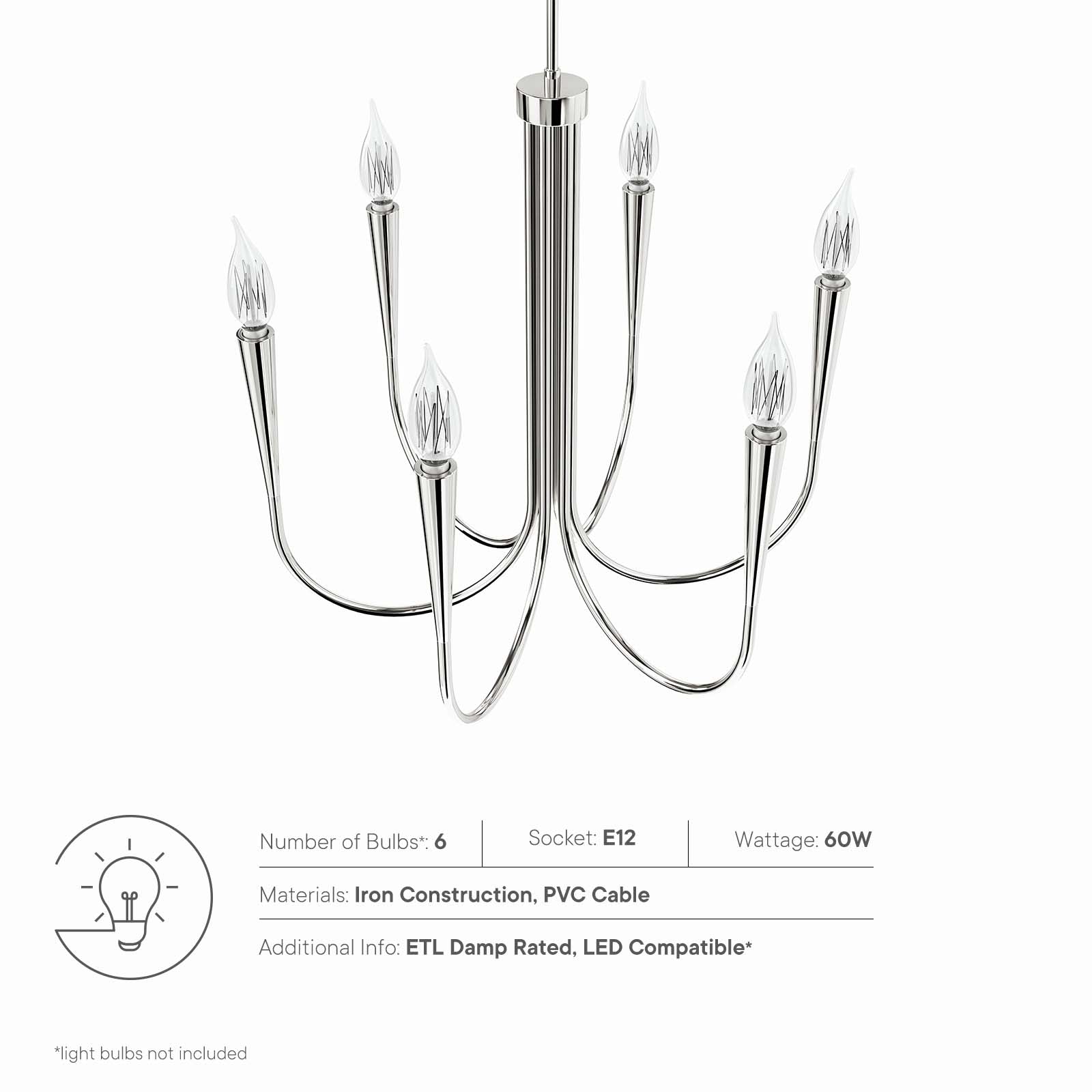 Sweeping lines and modern simplicity make the Penrose 6-Light Chandelier center stage in a home or apartment. A beautiful light fixture in the dining room, entryway, bathroom, or other living space, this pendant chandelier features six upturned metal arms that each hold a single exposed bulb (not included). Compatible with sloped ceilings, Penrose has a ceiling canopy with a swivel adaptor and features a five piece, height-adjustable hanging rod to suit a range of ceiling heights. This chandelier requires six E12 bulbs 60W max or LED equivalent (not included). UL Listed for Damp Locations. Luminaires that are “Suitable for Damp Locations” are approved for areas that are regularly exposed to moisture and condensation like the bathroom. Professional installation required.