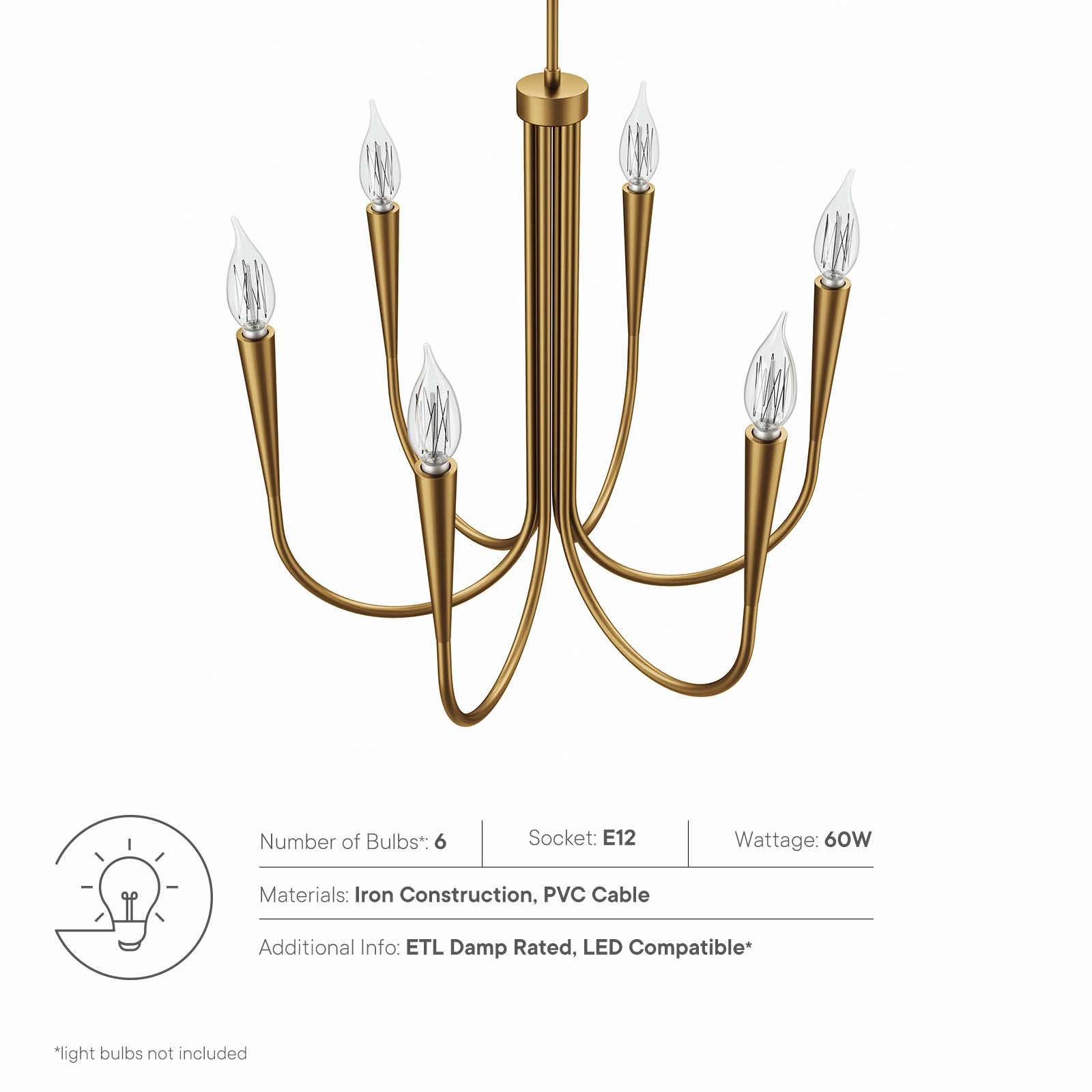 Sweeping lines and modern simplicity make the Penrose 6-Light Chandelier center stage in a home or apartment. A beautiful light fixture in the dining room, entryway, bathroom, or other living space, this pendant chandelier features six upturned metal arms that each hold a single exposed bulb (not included). Compatible with sloped ceilings, Penrose has a ceiling canopy with a swivel adaptor and features a five piece, height-adjustable hanging rod to suit a range of ceiling heights. This chandelier requires six E12 bulbs 60W max or LED equivalent (not included). UL Listed for Damp Locations. Luminaires that are “Suitable for Damp Locations” are approved for areas that are regularly exposed to moisture and condensation like the bathroom. Professional installation required.