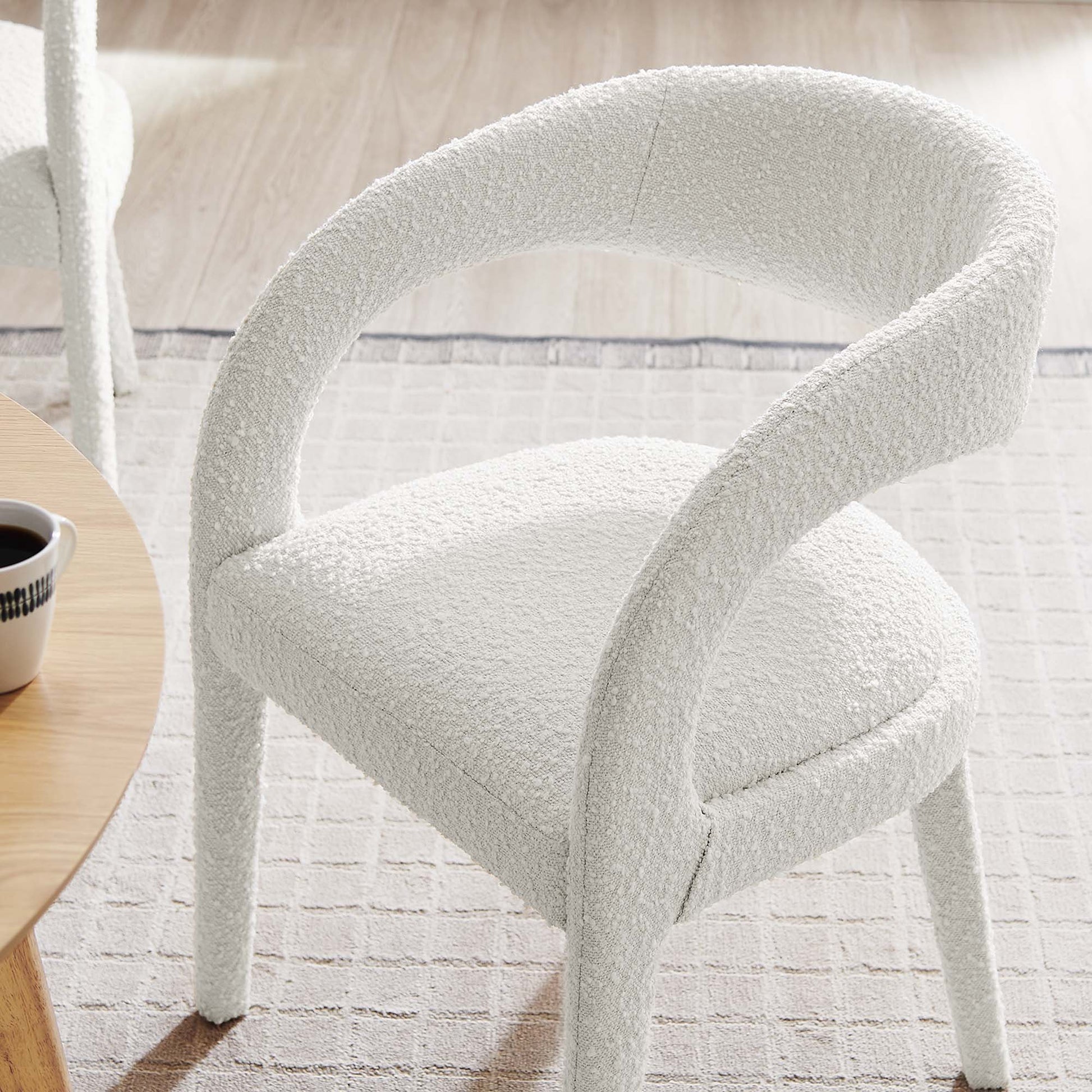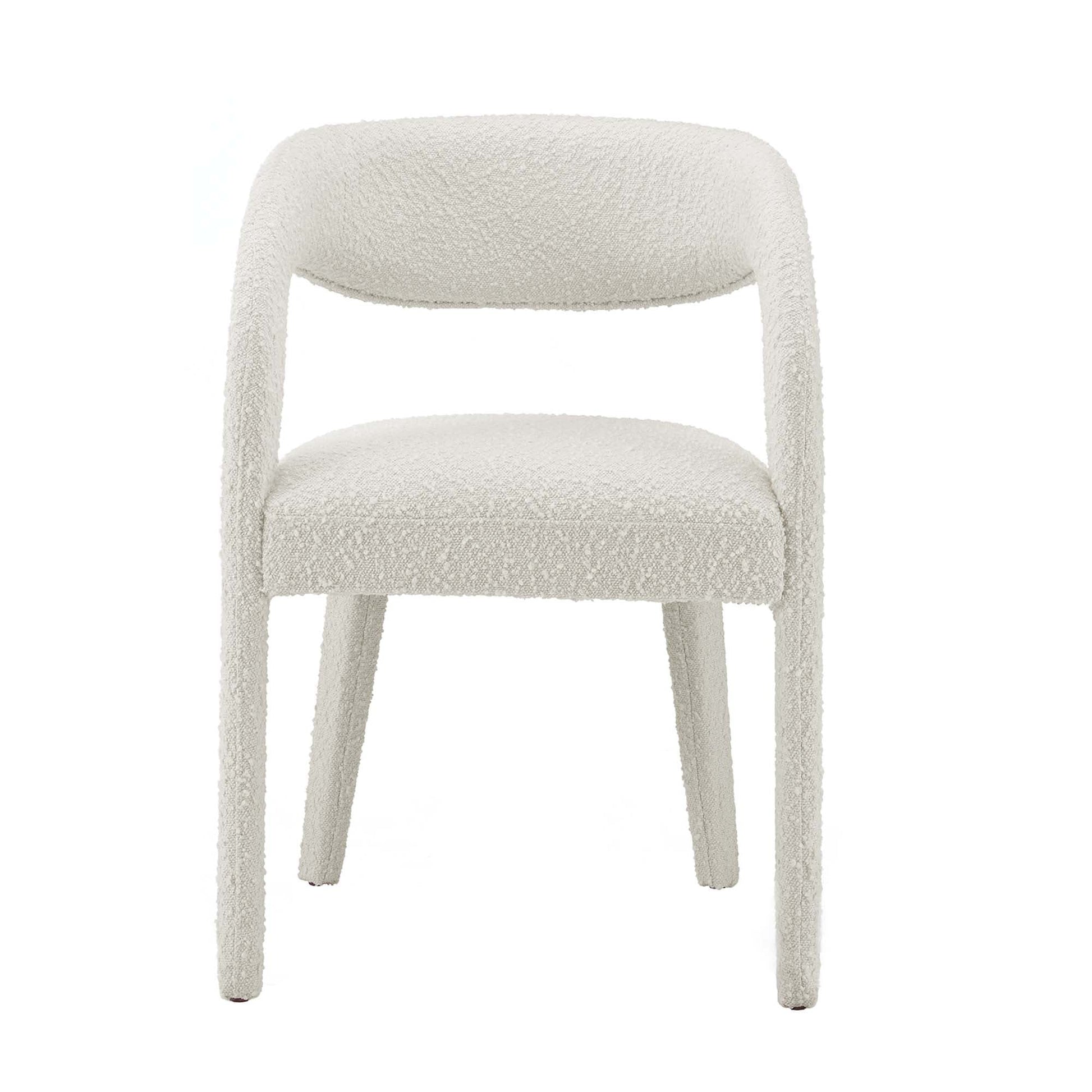 Experience the perfect blend of modern sophistication and luxurious comfort with the Pinnacle Boucle Upholstered Dining Chair Set of Two. The distinct silhouette showcases a curved backrest and an open design that effortlessly enhances your dining or living space with luxe style. This dining chair set indulges your senses with its dense foam padding, upholstered in a tactile, nubby textured boucle fabric. Non-marking plastic foot pins ensure your flooring remains free from scuffs and scratches. With minimal assembly needed, this set not only offers a stylish statement but also a hassle-free setup. Weight Capacity: 330 lbs. Overall Product Dimensions: 23"L x 21.5"W x 32"H