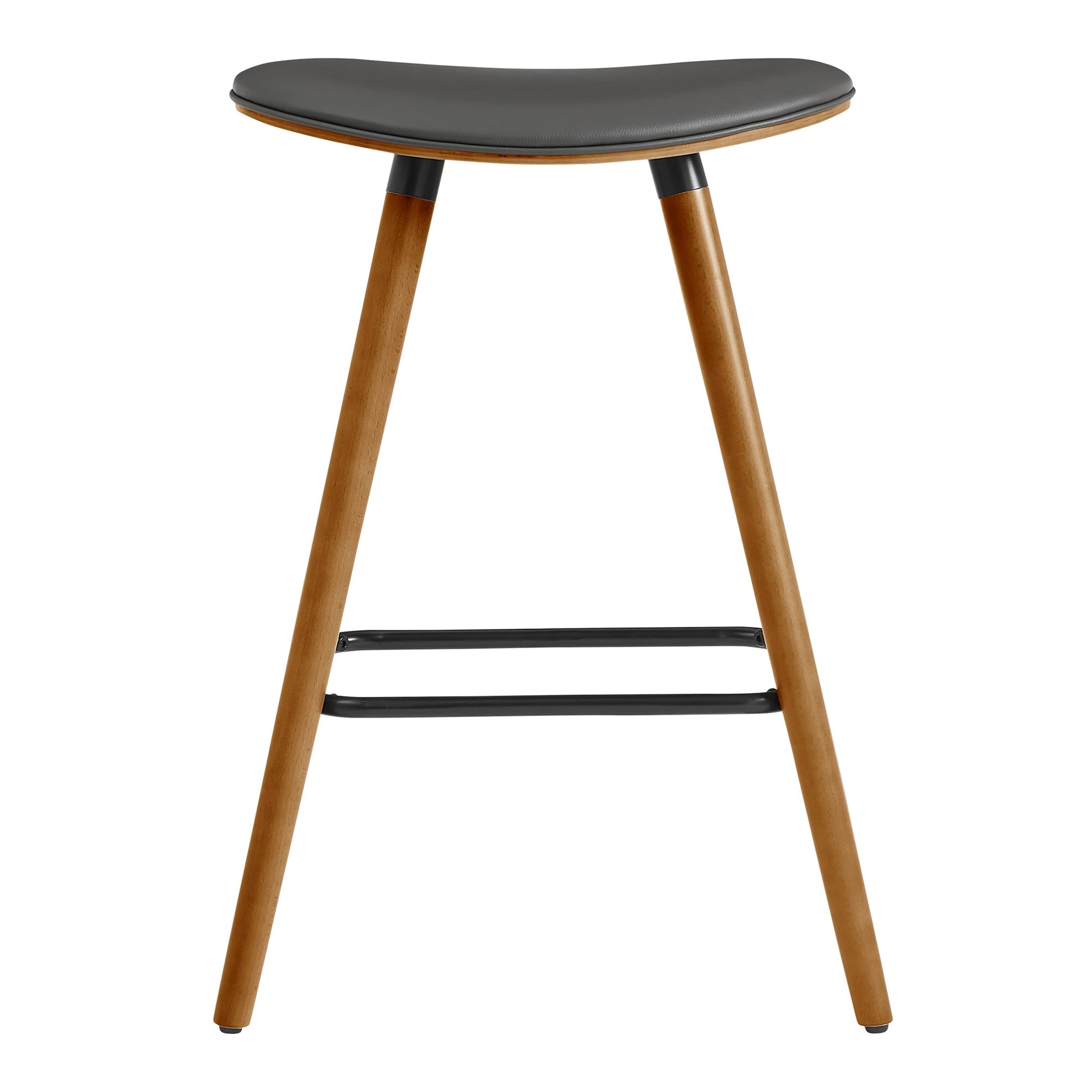 The Piper 26" Counter Height Backless Bar Stool in Gray Faux Leather and Walnut Wood from Armen Living is an ideal stool for any modern or contemporary household. This beautiful backless stool sports a sturdy wood frame beautifully accented by a black metal rectangular footrest - offering a stylish aesthetic without comprising the practicality or functionality of this item. The plush seat cushion is padded with high-density foam that will provide you with immense comfort. Though an excellent fit for the kitchen or bar, the Piper's novel yet practical look makes it great for enhancing the aesthetic of just about any room in your house. The Piper is available in your color choice of Gray, cream, or brown faux leather with walnut wood or Gray faux leather with black wood. Product Dimensions: W:19 x D:13 x H:26 x SH:26