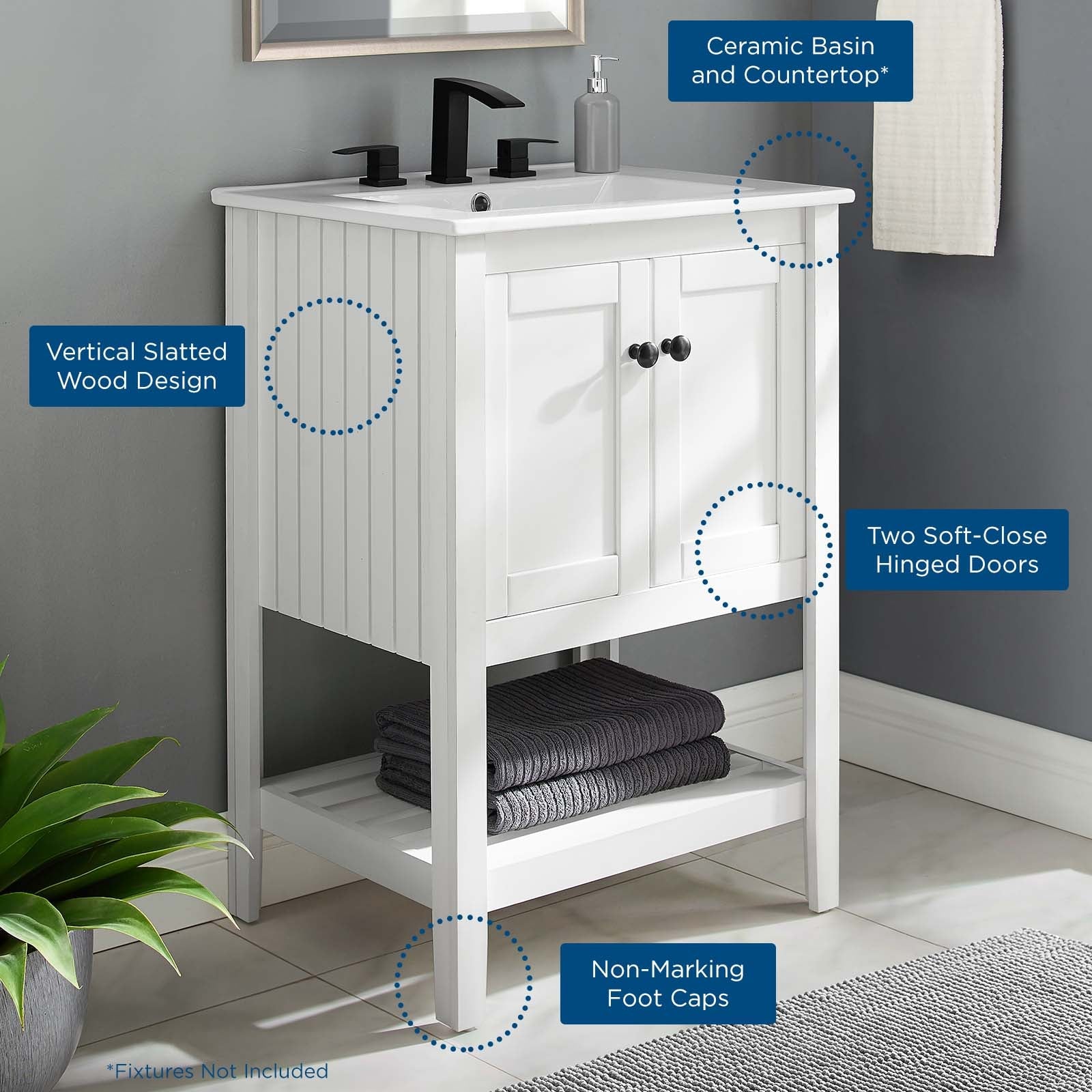 Mix rustic accents with crisp lines to produce the Prestige Bathroom Vanity. Prestige features a stylish side panel with a vertical slat design. Solidly constructed from wood and MDF particleboard, the Prestige Vanity has soft-close doors, interior hidden storage, and a slatted open exterior shelf. The Prestige Bathroom Vanity features a curved sink basin with 8-inch centerset faucet holes and brings country cottage style to a new level with hints of industrial modern edginess. Comes with non marking foot caps to protect flooring. Assembly required, fixtures not included.