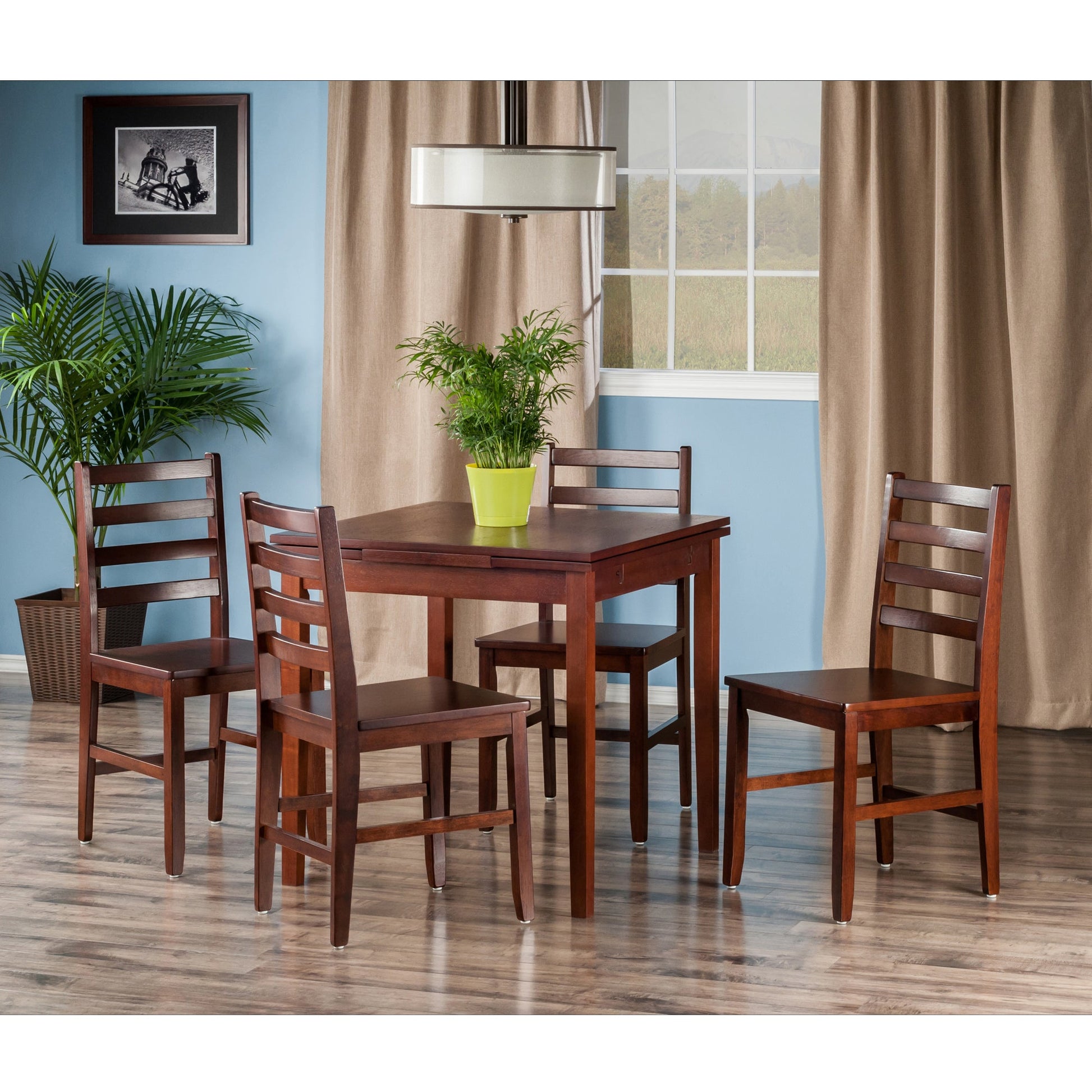 For smaller spaces, the Winsome Wood Pulman Dining set is a smart choice. Extend the table to add more surface area whenever extra table space is needed, each leaf adds nine more inches of tabletop, making this an excellent choice for a studio apartment or kitchen. Conserve valuable space as the extensions conveniently tuck away within the table body for a compact footprint. Suitable for a variety of homes and functions, comfortably accommodating up to 4 guests. This set includes four classically designed chairs that are a perfect complement to the table. Constructed of sturdy solid wood for long lasting durability and finished in a rich walnut, this set can be incorporated effortlessly into nearly any existing decor. Ships in 3 boxes that include the hardware necessary for assembling. Replacement part request can be submitted directly to the manufacturer within 60 days from date of purchase.