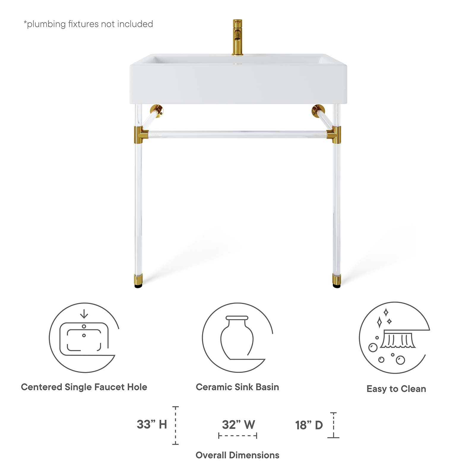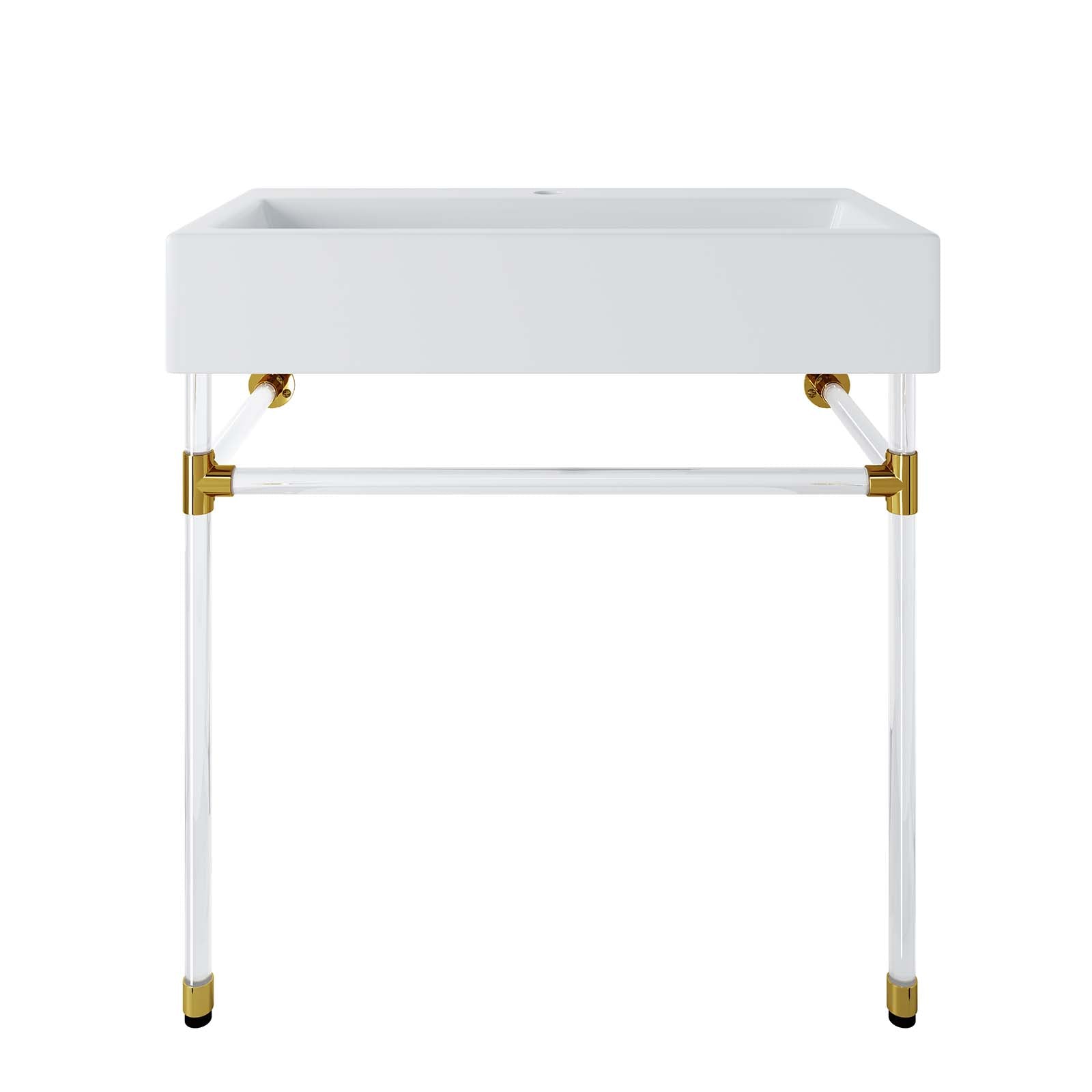 Create a bathroom oasis with the minimalist style and efficiency of the Redeem Wall-Mount Acrylic Bathroom Vanity. The glossy white ceramic basin and streamlined acrylic frame affix directly and securely to the bathroom or powder room wall. Redeem dispenses gentility in spaces large and small, resting confidently on a sturdy acrylic frame with gold joints for added stability. This bathroom vanity has a single faucet hole and is outfitted with non-marking foot caps to protect your bathroom floor. Assembly required and fixtures not included.