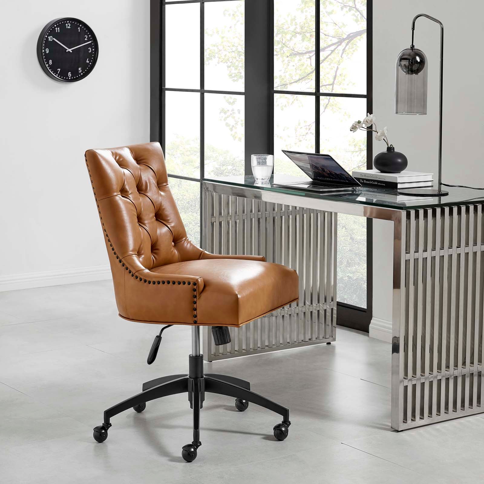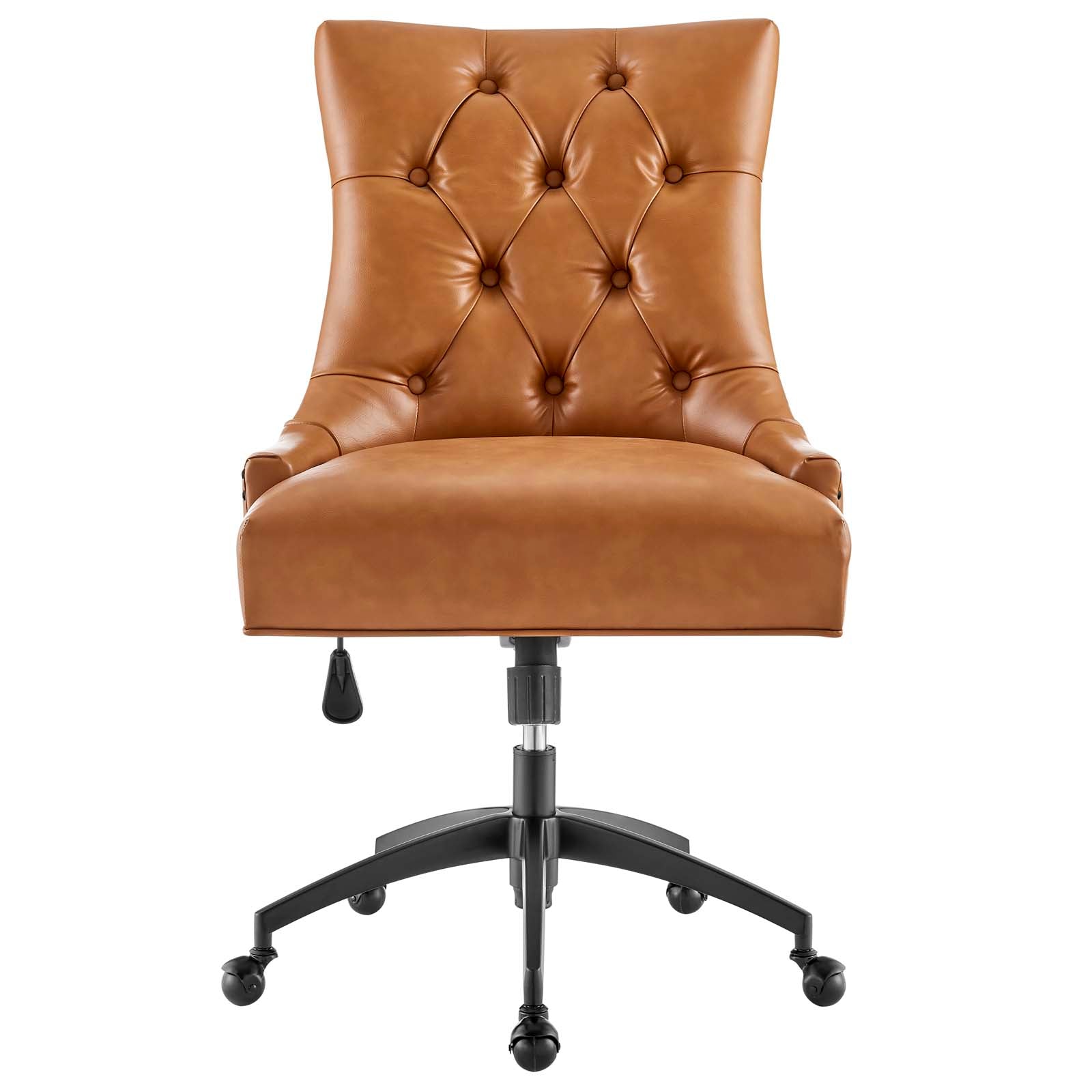Introduce vintage flair and glam deco appeal with the Regent Tufted Vegan Leather Swivel Office Chair. Metal nailhead trim and tufted buttons provide visual depth, while a luxuriously padded upholstered vegan leather back and seat for exceptional support to this superbly constructed computer desk chair. A matte black metal base and five single ball nylon casters provide easy movement over hardwood or carpeted surfaces while a full 360-degree swivel, tilt tension control, and pneumatic height adjustment create a custom seating experience for optimal performance. Perfect for the modern home or office, this vegan leather office chair is a desirable addition to any workspace. Chair Weight Capacity: 287 lbs.