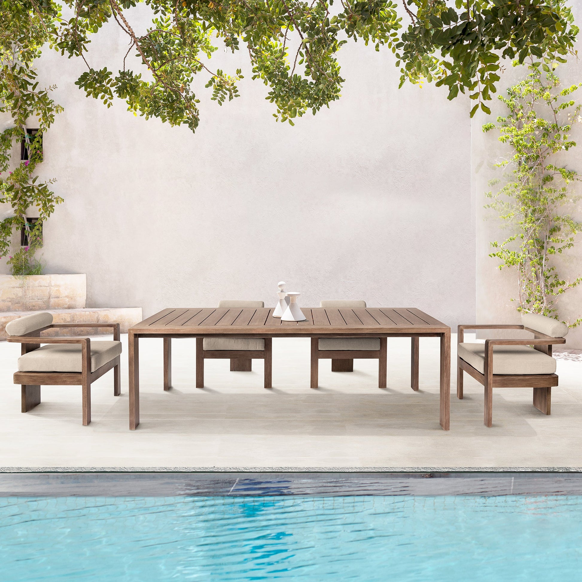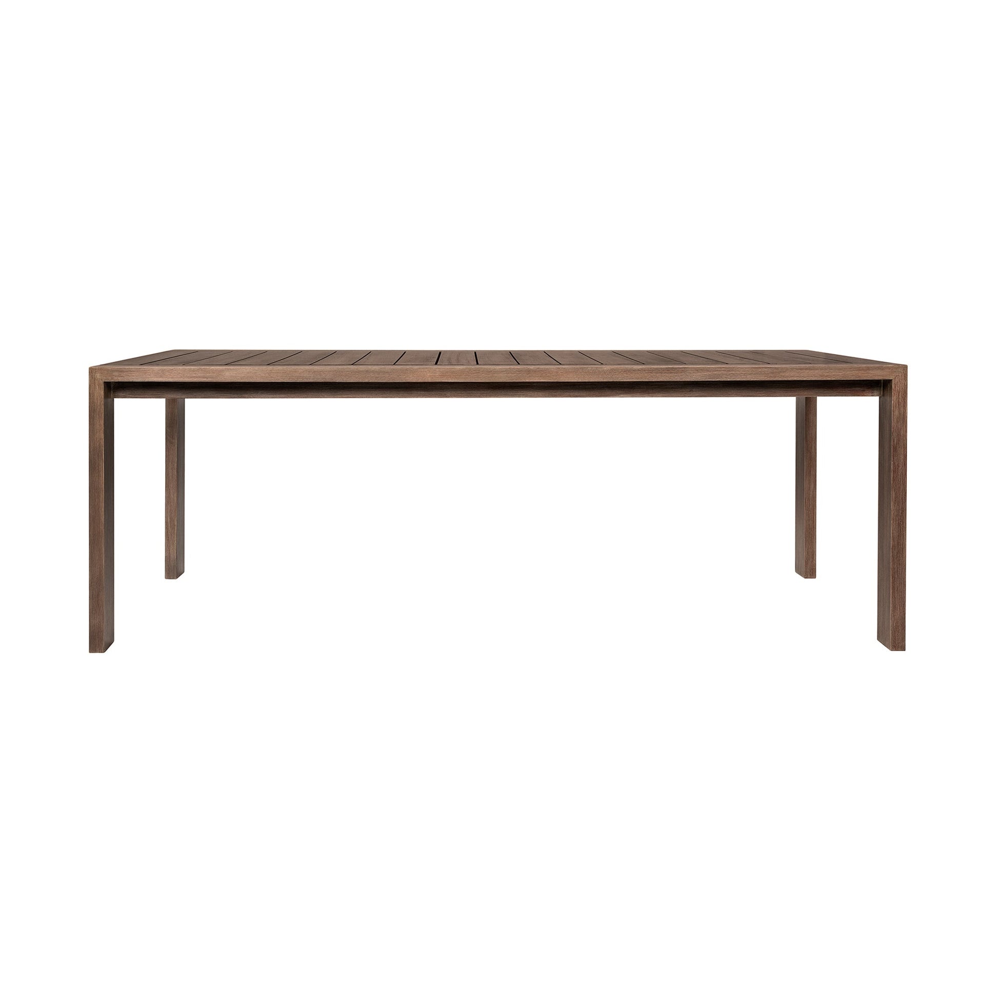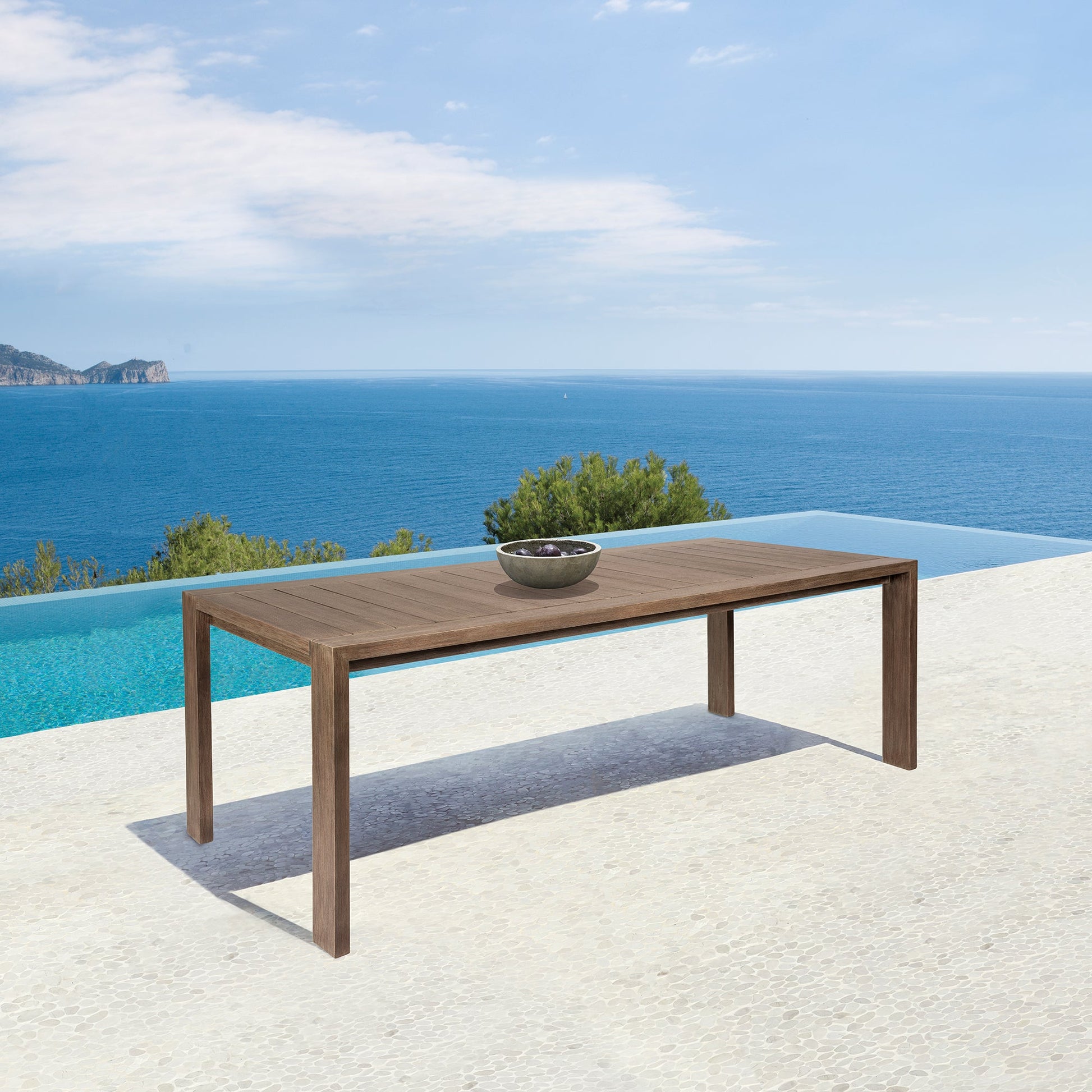 Introducing the Relic Outdoor Patio Dining Table – a testament to the beauty of weathered Eucalyptus wood, skillfully crafted to enhance your outdoor living space with a touch of rustic charm. This outdoor dining table seamlessly combines the aged allure of weathered Eucalyptus wood with the practicality of water-resistant and UV-resistant features, creating a distinctive piece of outdoor dining furniture that exudes character and durability. The weathered Eucalyptus wood frame of the Relic Outdoor Patio Dining Table adds a unique and inviting aesthetic to your patio, offering a timeless appeal that only improves with time. Each knot and grain tells a story, creating an ambiance of rustic elegance that complements various outdoor settings. Designed to withstand the elements, this dining table boasts water-resistant and UV-resistant Eucalyptus, ensuring that it remains resilient and stylish in the face of changing weather conditions. Whether under the sun's warm embrace or during an unexpected drizzle, the Relic Dining Table stands as a steadfast focal point for your outdoor gatherings. Elevate your outdoor aesthetic with the Relic Outdoor Dining Table in Weathered Eucalyptus Wood.