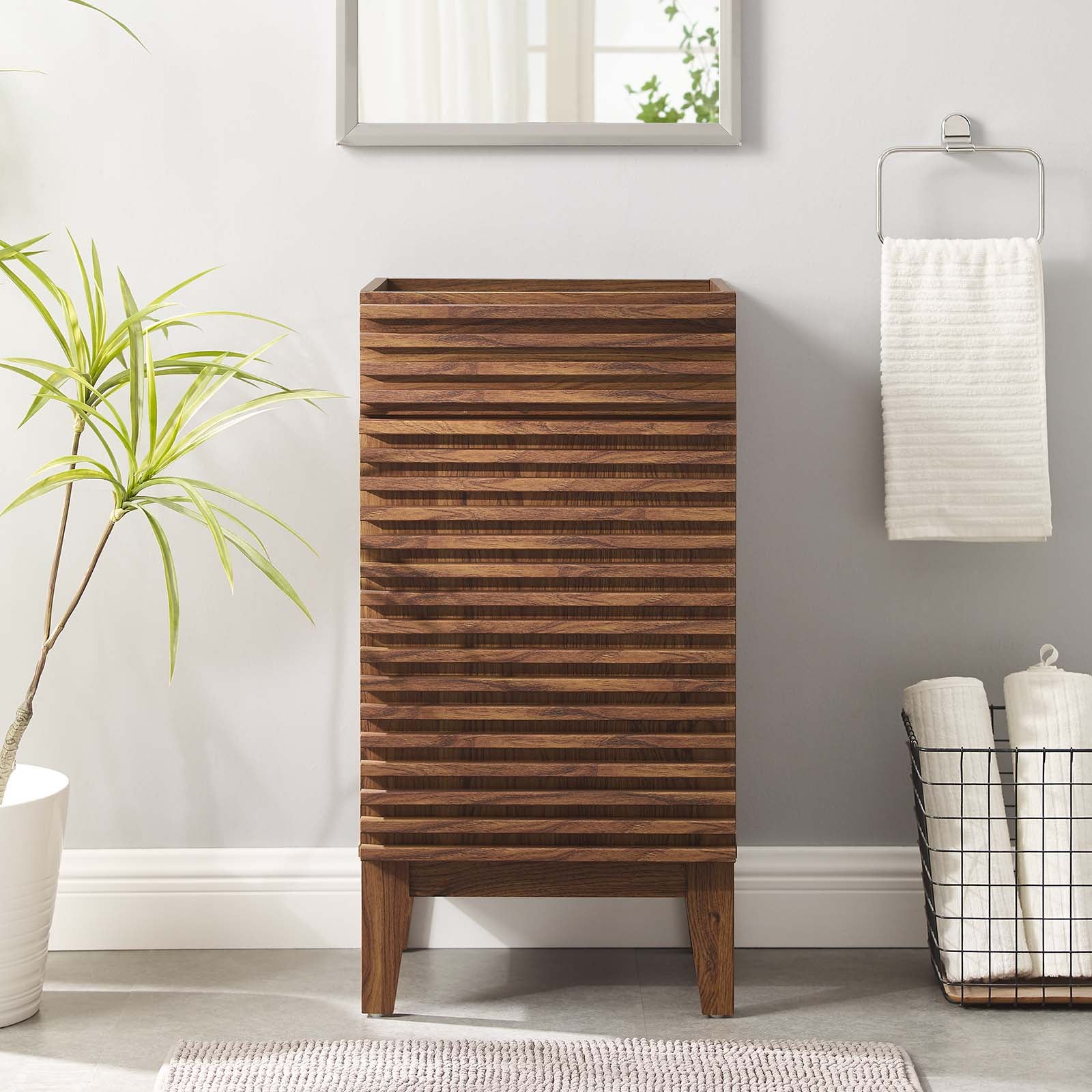 Tap into mid-century aesthetics with the Render 18" Vanity Cabinet. The Render Bathroom Vanity features a durable particleboard frame with a smooth laminate, four tapered wood legs, and an adjustable storage shelf behind a soft-close hinged door. Sleek lines and crisp design align for an edgy style designed to meet your needs. Boasting a mid-century modern style, this vanity features a solid construction with a pleasing look and practical functionality. Assembly required. Sink basin and fixtures not included.