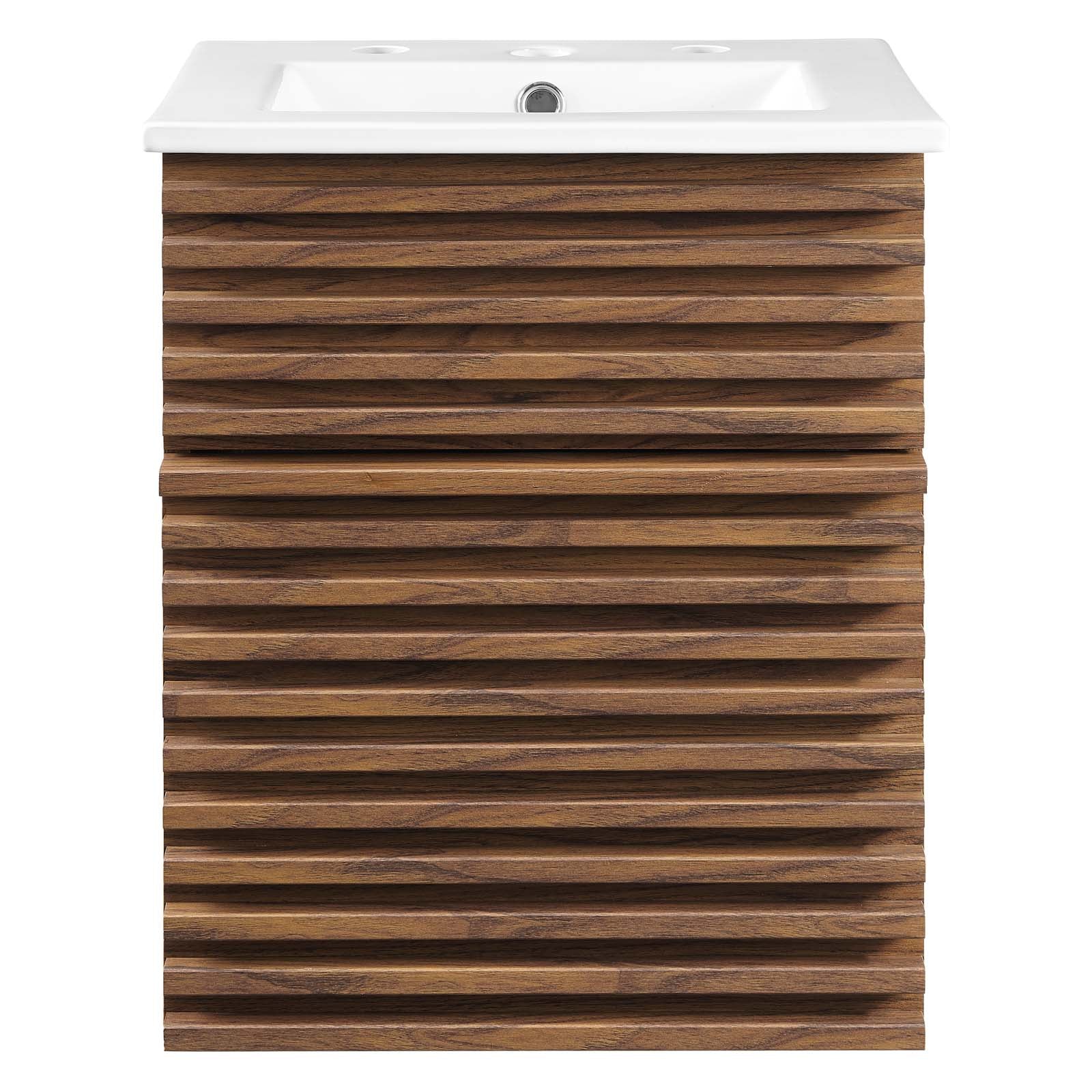 Tap into mid-century aesthetics with the Render Vanity. The Render 18" Bathroom Vanity features a durable MDF and particleboard frame with smooth walnut grain laminate, ample storage space in a full-extension drawer, and space-saving wall-mount design. Crafted with ceramic, a single sink with an integrated countertop, 8" centerset faucet holes, and rectangular sink basin continues the sleek look of this retro modern vanity. Clean lines and crisp design align for an edgy style designed to meet your needs. Boasting a mid-century modern style, this vanity features a solid construction with a pleasing look and practical functionality. Assembly required and fixtures not included.