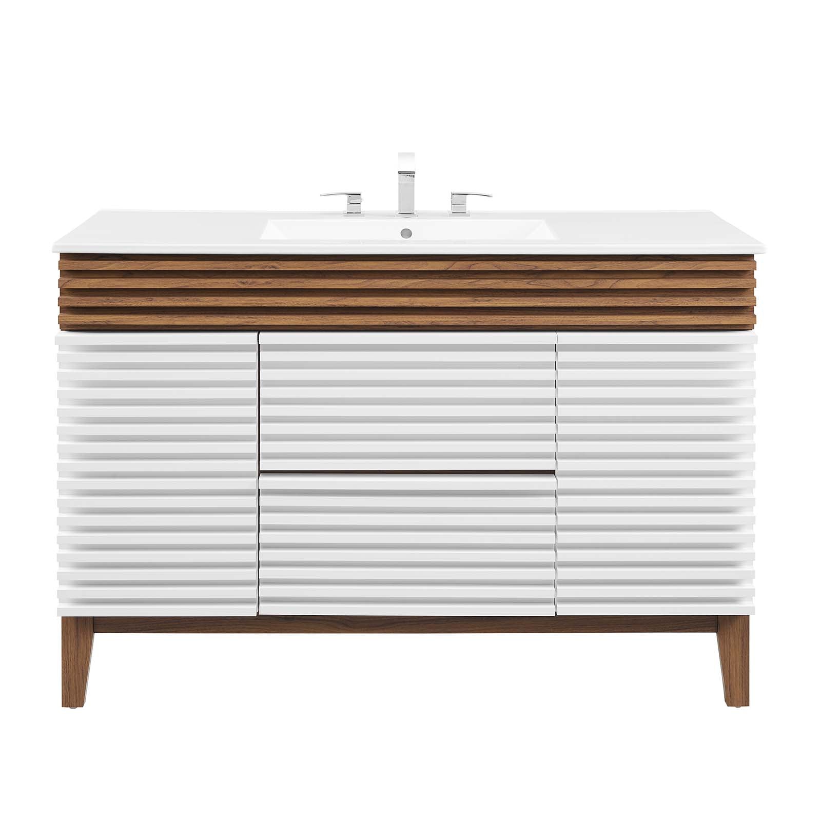 Tap into mid-century aesthetics with the Render Vanity. The Render 48" Bathroom Vanity features a durable MDF and particleboard frame with smooth walnut grain laminate, four tapered wood legs, and ample under sink storage space in full-extension drawers and behind soft-close hinged doors. Crafted with ceramic, a single sink with an integrated countertop, 8" widespread, and rectangular sink basin continue the sleek look of this retro modern vanity. Clean lines and crisp design align for an edgy style designed to meet your needs. Boasting a mid-century modern style this vanity features a solid construction with a pleasing look and practical functionality. Assembly required and fixtures not included.
