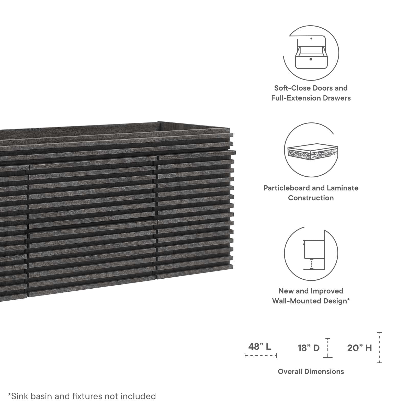 Tap into mid-century aesthetics with the Render Vanity Cabinet. The Render 48" Bathroom Vanity features a durable MDF and particleboard frame with a smooth laminate, ample storage space in two full-extension drawers, and space-saving wall-mount design with a drywall friendly mounting cleat. Clean lines and crisp design align for an edgy style designed to meet your needs. Boasting a mid-century modern style this vanity features a solid construction with a pleasing look and practical functionality. Assembly required. Sink basin and fixtures not included.