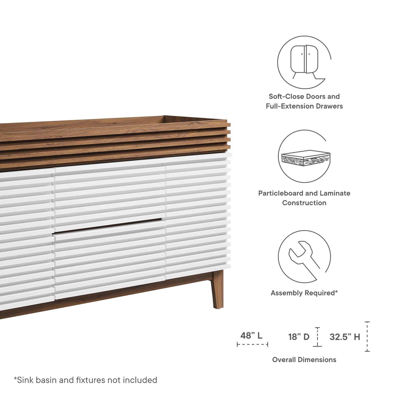 Tap into mid-century aesthetics with the Render 48" Vanity Cabinet. The Render Bathroom Vanity features a durable particleboard frame with a smooth laminate, four tapered wood legs, full extension drawers, and adjustable storage shelves behind soft-close hinged doors. Sleek lines and crisp design align for an edgy style designed to meet your needs. Boasting a mid-century modern style, this vanity features a solid construction with a pleasing look and practical functionality. Assembly required. Sink basin and fixtures not included.