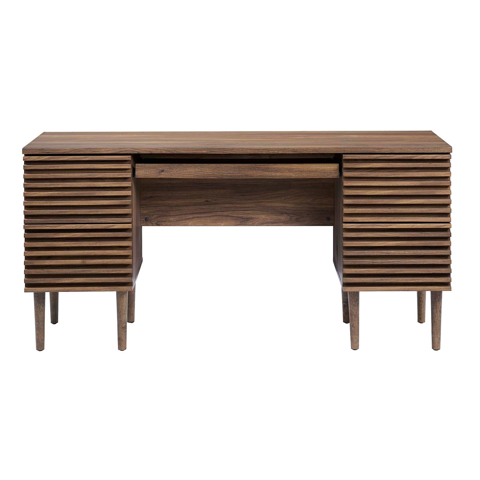 Tap into mid-century aesthetics with the Render Office Desk. This office desk features a durable particleboard frame with a smooth walnut grain laminate. A pull-out keyboard tray and four full-extension glide drawers offer ample storage space for all your office essentials. Boasting a mid-century modern style and resting on tapered wood legs, this computer desk features a solid construction with a pleasing look and practical functionality. Perfect for the apartment, home office, or dorm room. Includes non-marking foot pads. Assembly required.