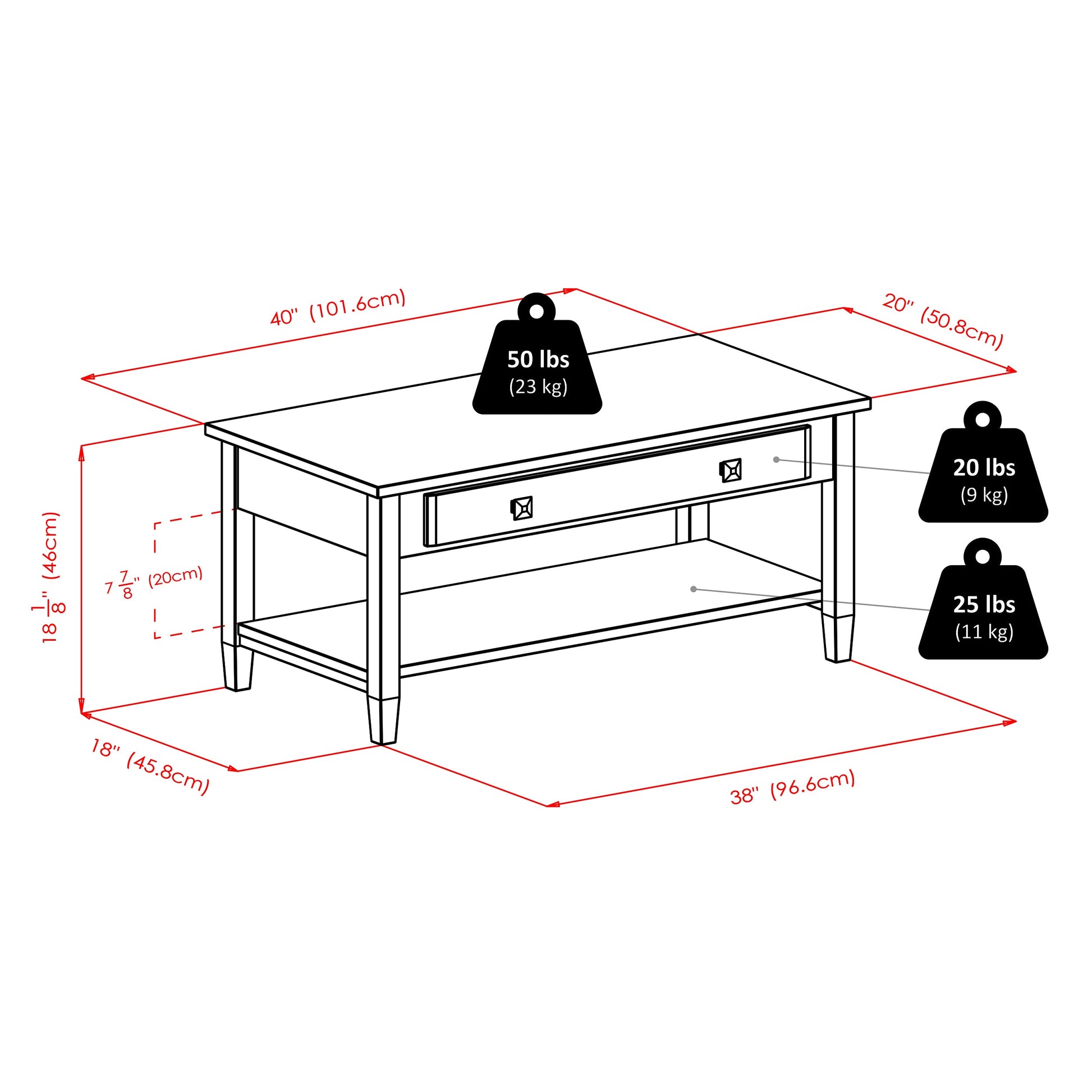 Richmond Coffee Table has clean profile, perfect for living or family room. This compact console offers layers of function with one larger drawer and a bottom shelf. Overall table size is 40"W x 20.53"D x 18.11"H. Table Top Dimension is 40"W x 20"D. Drawer inside dimension is 28.82"W x 11.29"D x 2.59"H. Shelf size is 37.95"W x 15.27"D. Clearance from apron to shelf is 7.87". Constructed with combination of solid and composite wood in warm Antique Walnut finish. Assembly Required.Dimensions : 40 in. Wide 20.53 in. Deep 18.11 in. High