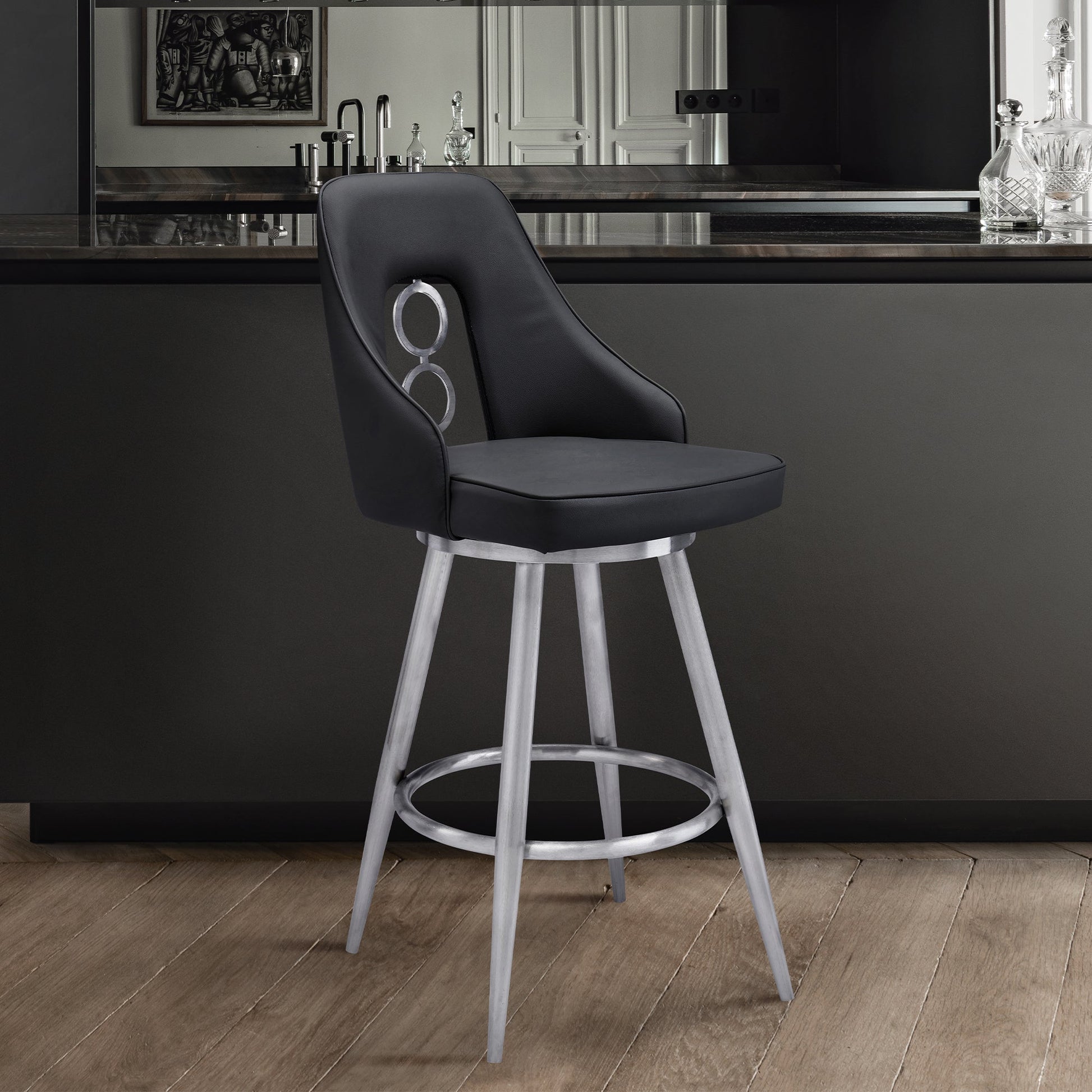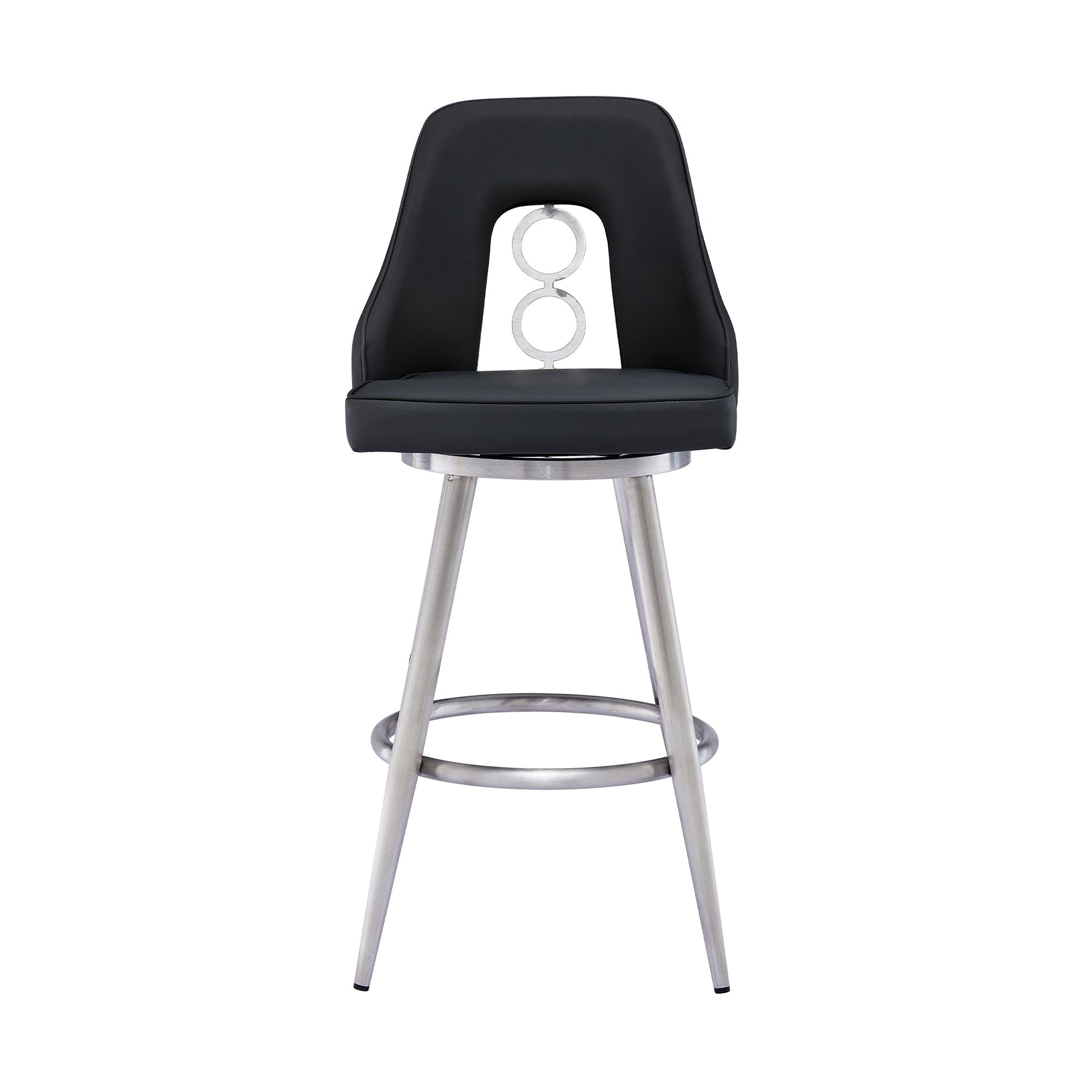 Ruby 26" Counter Height Swivel Black Faux Leather and Brushed Stainless Steel Bar Stool