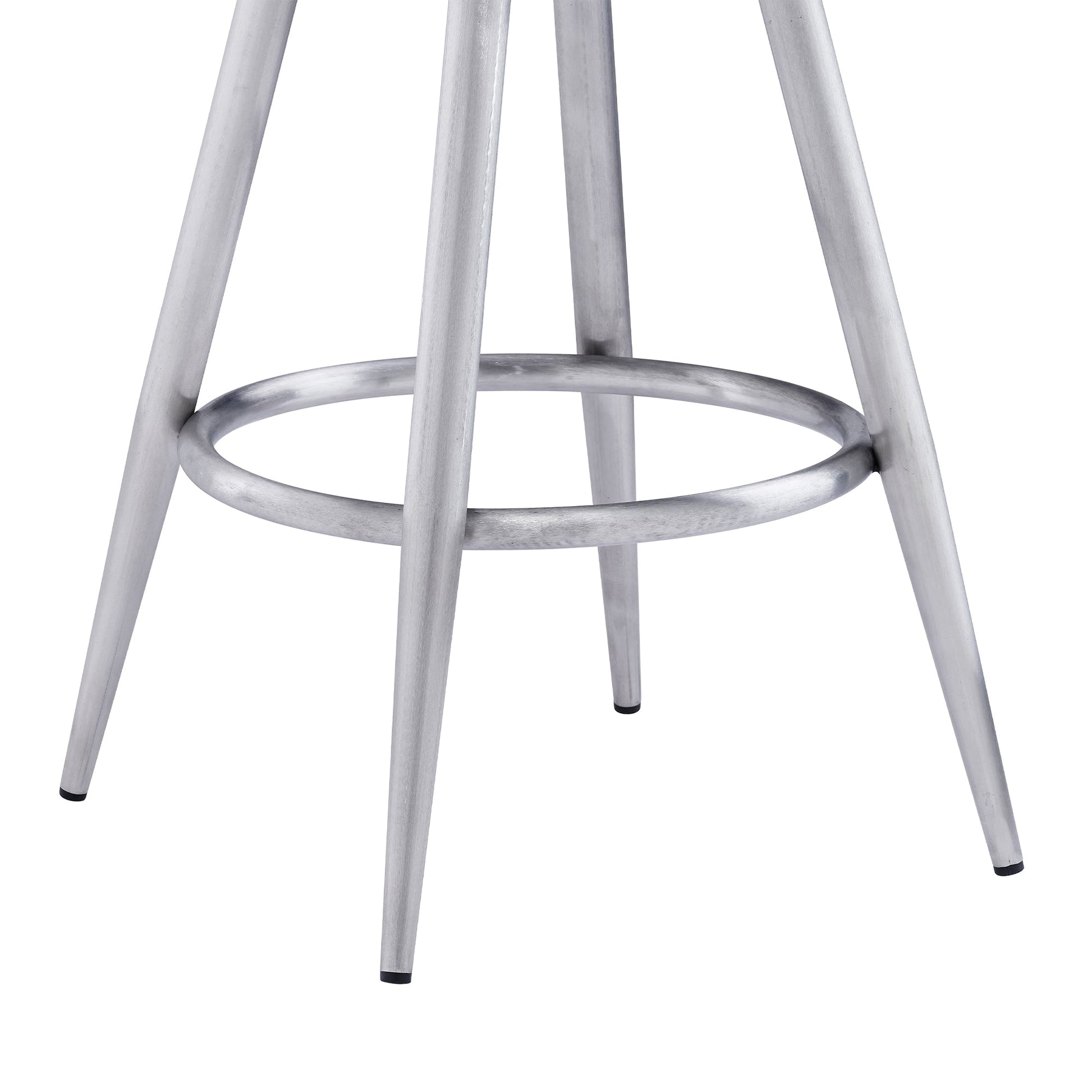 The Ruby 26" Counter Height Swivel Black Faux Leather and Brushed Stainless Steel Bar Stool from Armen Living is the perfect addition to any home or apartment! The Ruby’s soft faux leather upholstery is wrapped around a high-density foam cushion that provides ultimate comfort without compromising style. The circular metal feature in the back makes for a stylish addition as well as providing you with easy breathable seating. The sturdy metal legs are tipped with floor protectors, assuring that the counter stool will not slip on or scratch hardwood or tile floors and presents a ring footrest that further accentuates its convenience. The armless design makes the Ruby an easy stool to incorporate into your kitchen, office, home bar, or den where it can come as close to the surface as needed. A 360-degree swivel function allows your guests to engage regardless of their place in the room at parties or gatherings, making this kitchen stool ideal for entertaining friends and families. The Ruby stool is available in your choice of a brushed stainless-steel finish with black or gray faux leather upholstery or a black finish with gray upholstery and they come in 26” or 30” seat heights.