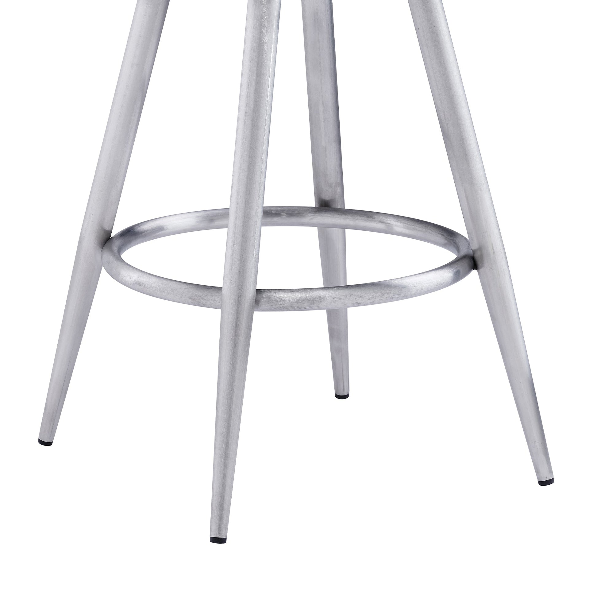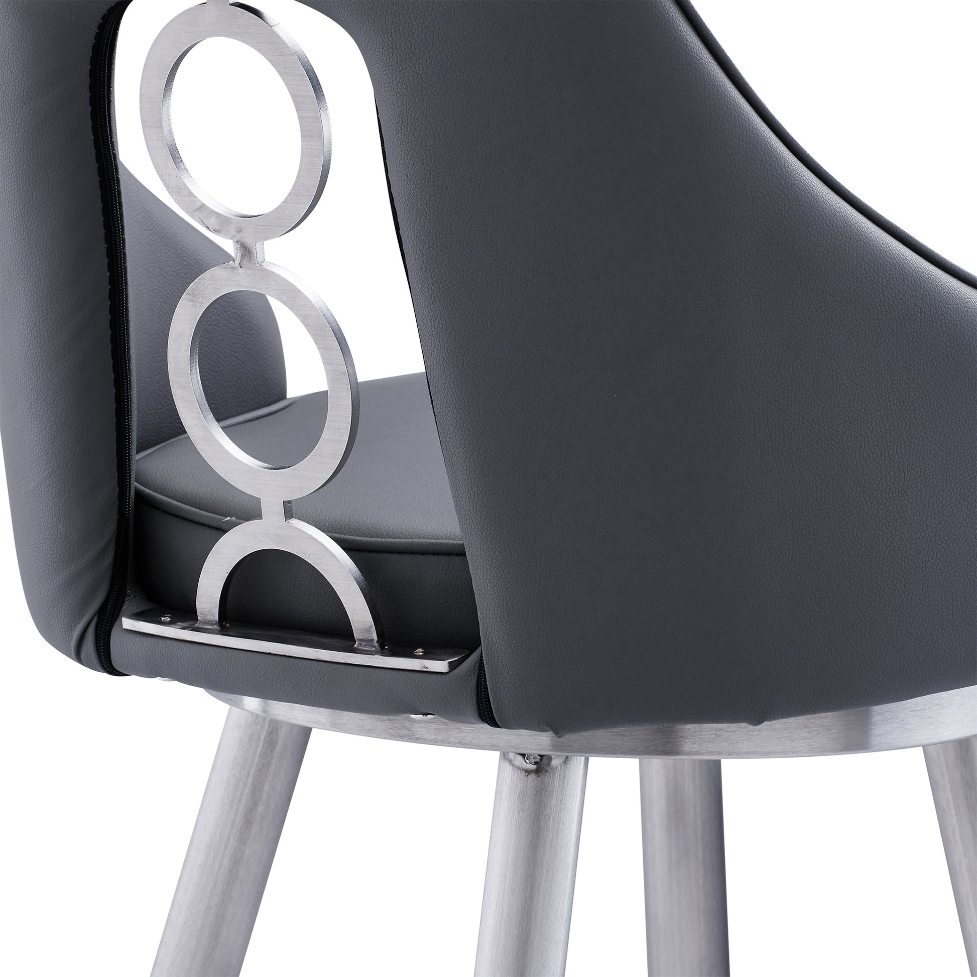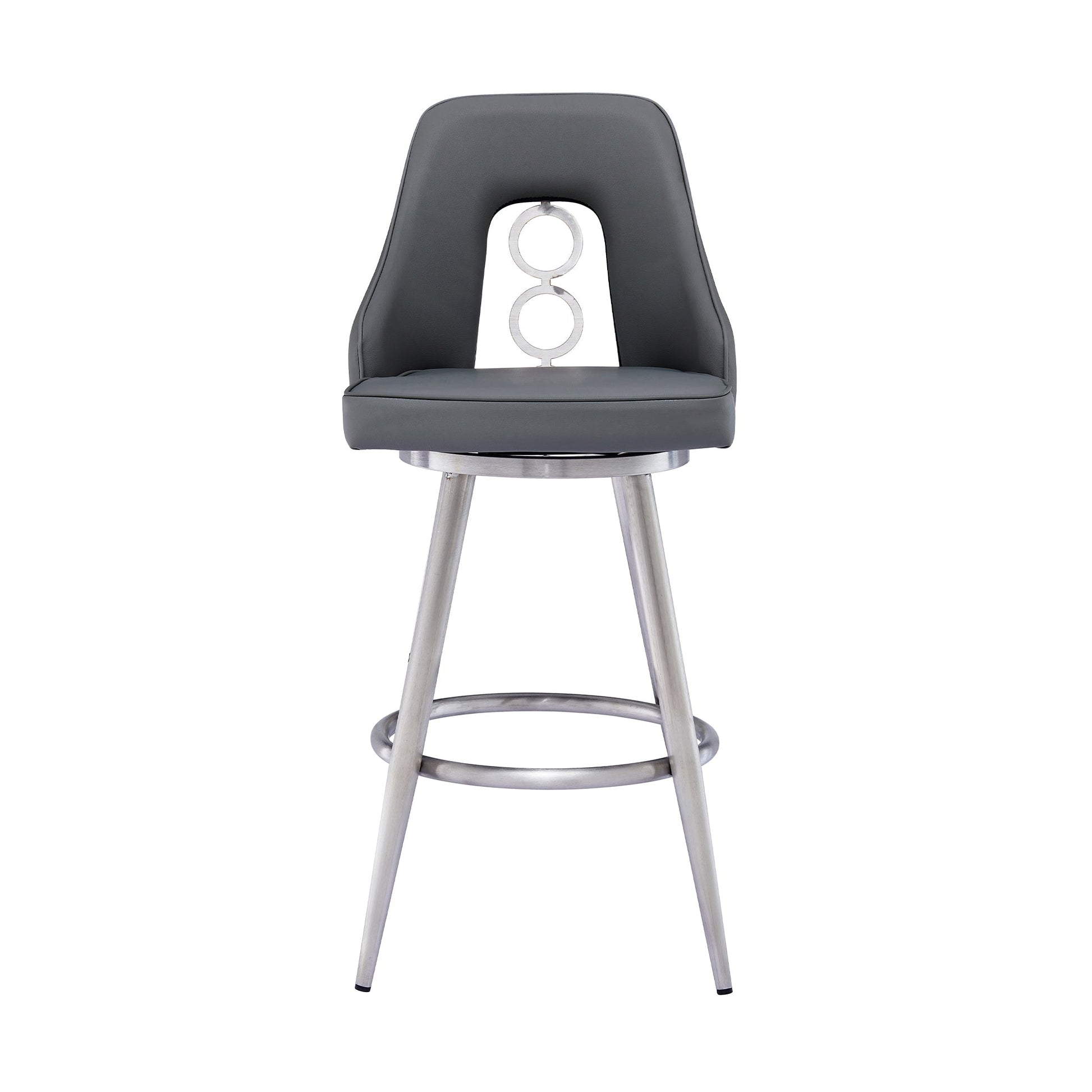 The Ruby 26" Counter Height Swivel Gray Faux Leather and Brushed Stainless Steel Bar Stool from Armen Living is the perfect addition to any home or apartment! The Ruby’s soft faux leather upholstery is wrapped around a high-density foam cushion that provides ultimate comfort without compromising style. The circular metal feature in the back makes for a stylish addition as well as providing you with easy breathable seating. The sturdy metal legs are tipped with floor protectors, assuring that the counter stool will not slip on or scratch hardwood or tile floors and presents a ring footrest that further accentuates its convenience. The armless design makes the Ruby an easy stool to incorporate into your kitchen, office, home bar, or den where it can come as close to the surface as needed. A 360-degree swivel function allows your guests to engage regardless of their place in the room at parties or gatherings, making this kitchen stool ideal for entertaining friends and families. The Ruby stool is available in your choice of a brushed stainless-steel finish with black or gray faux leather upholstery or a black finish with gray upholstery and they come in 26” or 30” seat heights.