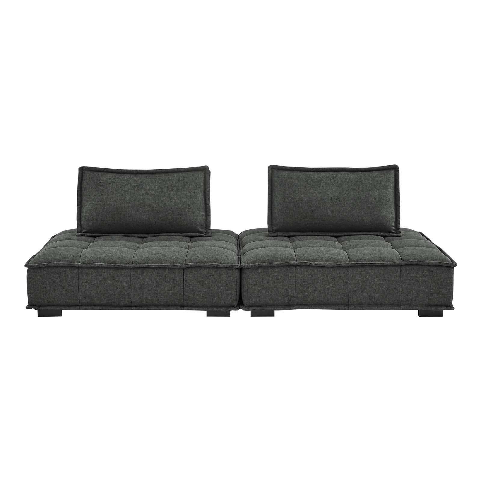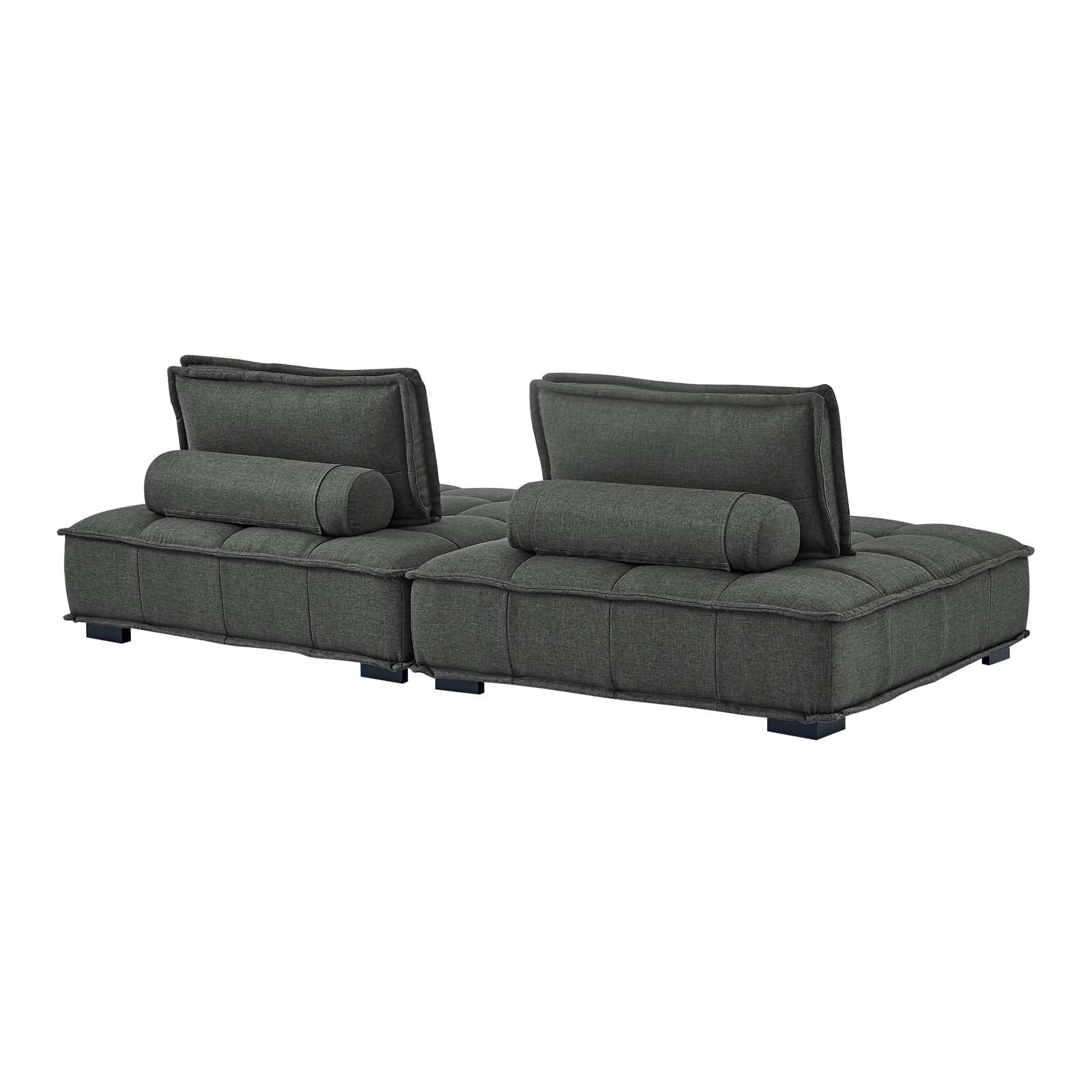 Sprawl out amidst comfort and style on the Saunter Tufted Fabric 2-Piece Loveseat. With square biscuit tufting, French piping detail, and soft polyester upholstery, this sectional sofa collection brings tailored style to your living space or lounge area with its charming low profile silhouette. A removable bolster pillow supporting a seat back cushion offers a comfortable place to rest while watching TV, relaxing, or entertaining. Dense foam padding and a sinuous spring support system grant a premium seating experience for all occasions. This two-piece loveseat rests atop L-shaped rubberwood legs with non-marking foot caps. Set Includes: 2 Armless Chairs; Weight Capacity Each Chair: 300 lbs.