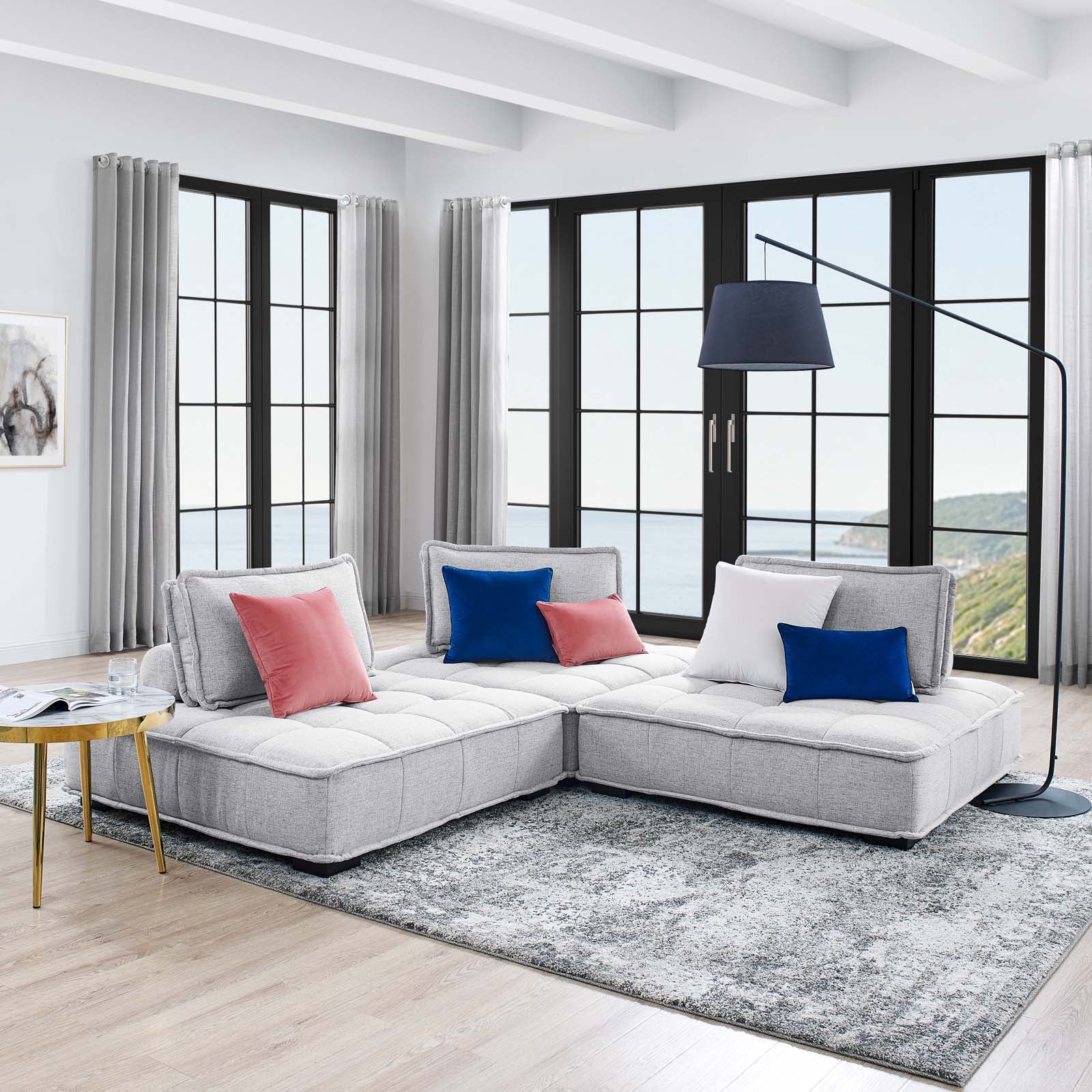 Sprawl out amidst comfort and style on the Saunter Tufted Fabric 3-Piece Sofa. With square biscuit tufting, French piping detail, and soft polyester upholstery, this sectional sofa collection brings tailored style to your living space or lounge area with its charming low profile silhouette. A removable bolster pillow supporting a seat back cushion offers a comfortable place to rest while watching TV, relaxing, or entertaining. Dense foam padding and a sinuous spring support system grant a premium seating experience for all occasions. This three-piece sofa rests atop L-shaped rubberwood legs with non-marking foot caps. Set Includes: 3 Armless Chairs; Weight Capacity Each Chair: 300 lbs.