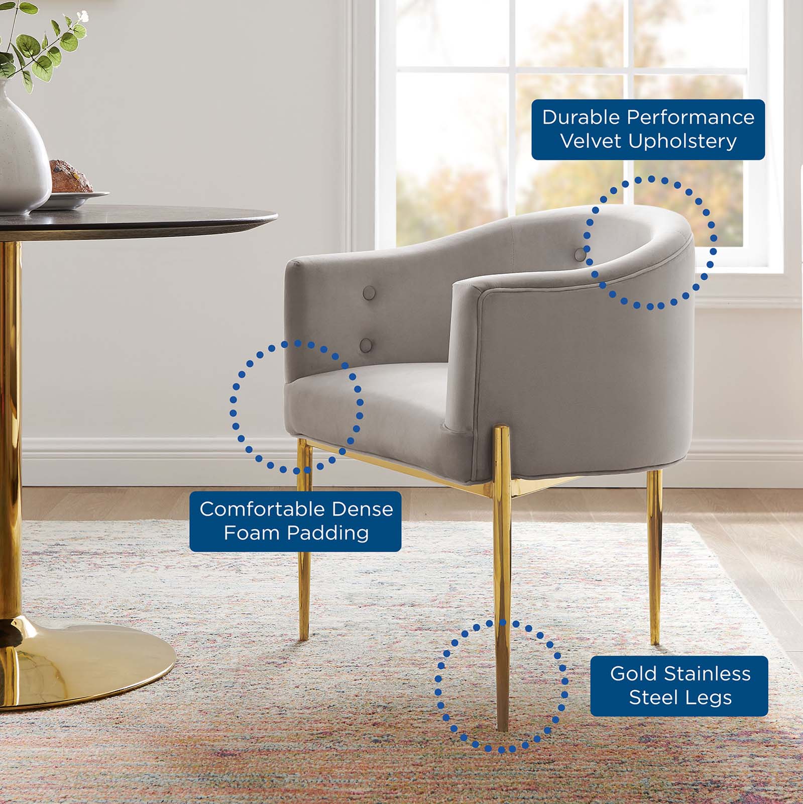 Bring luxe elegance to your living space or dining room with the Savour Tufted Performance Velvet Accent Armchairs. Featuring a sweeping silhouette and updated club chair design, this velvet chair set of two is suited for the dining table or living room, entryway, bedroom, or office as an accent chair. These accent chairs are upholstered in stain-resistant performance velvet upholstery and feature dense foam padding to offer a comfortable seat while dining, working, reading, or relaxing. Resting on chrome gold stainless steel legs, this versatile accent chair set has interior button tufting and a charming curved shape. Chair Weight Capacity: 300 lbs.
