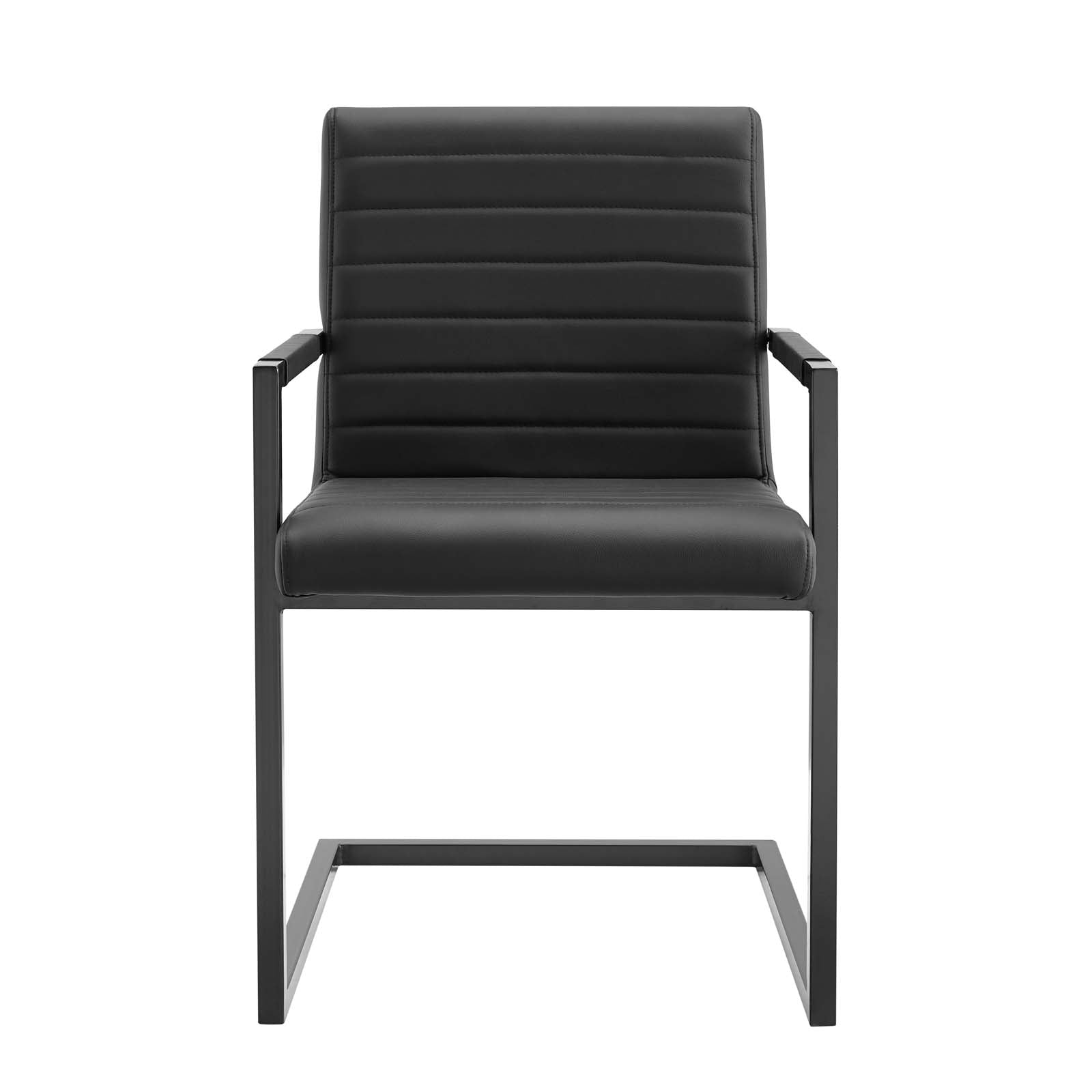Bring contemporary intrigue and retro modern style to your dining space with the Savoy Vegan Leather Dining Chairs - Set of 2. Vegan leather upholstery makes this armchair perfect for the dining room or living space, while horizontal channel tufting brings mid-century detail. This accent chair features a sled base crafted with square tubular powder-coated metal, non-marking foot caps, and padded armrests. Dense foam padding offers a supportive seat while dining or relaxing. Chair Weight Capacity: 300 lbs.