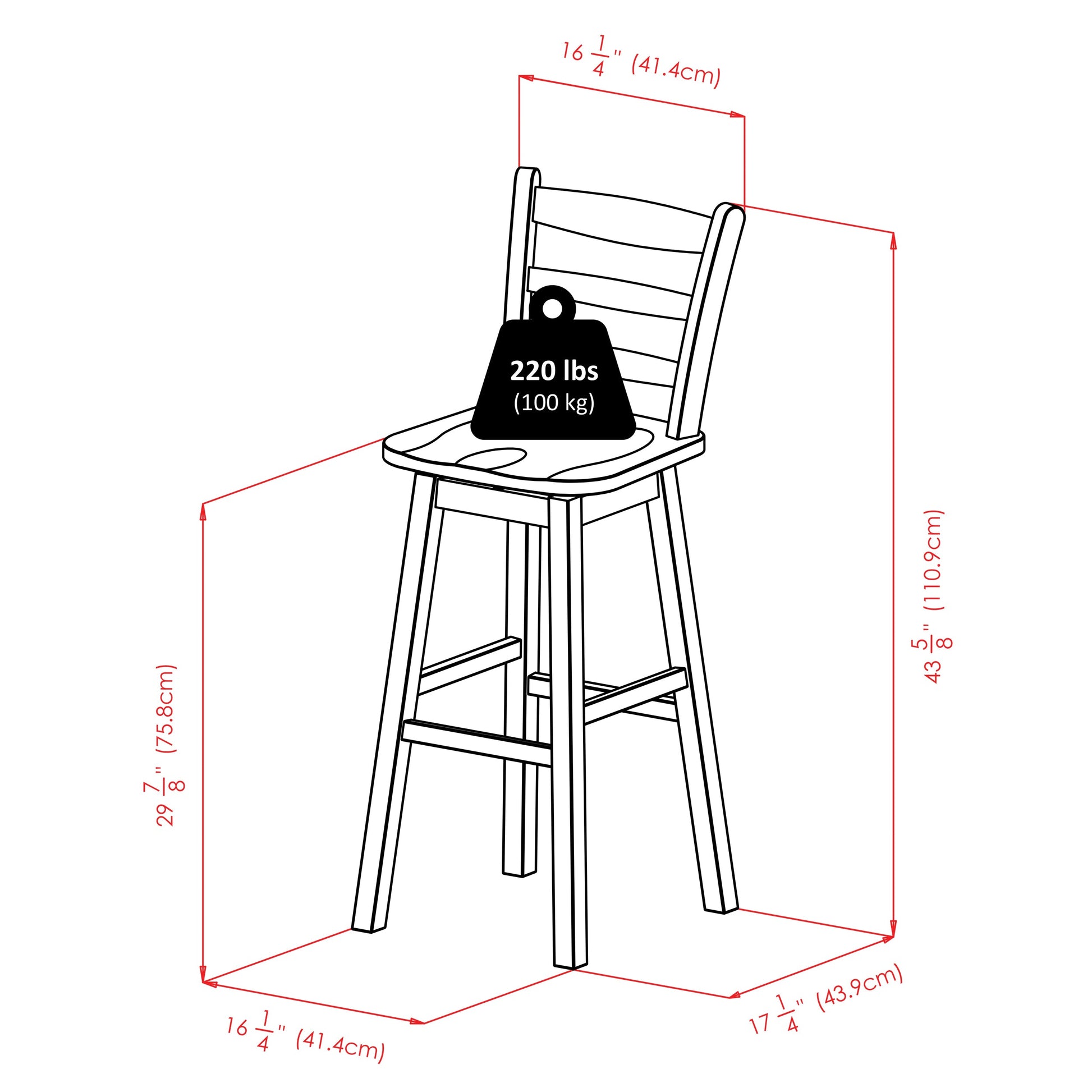 The Scalera Ladder-Back Swivel Bar Stool by Winsome Wood combines classic design with the allure and strength of solid wood. The slats on the ladder back are crafted with gentle arcs that add a graceful note to the stool's traditional look while also providing comfortable back support. Sturdy, squared legs are reinforced with solid crossbars that also serve as footrests. And the seat swivels 360 degrees, perfect for finding just the right angle for casual dining or conversation with a friend. The wide 16.3” seat has rounded edges and is contoured for comfort. Finished in a rich walnut that can easily mesh with most home decor. Conveniently packed and shipped in 1 box, that includes the hardware needed for assembly.