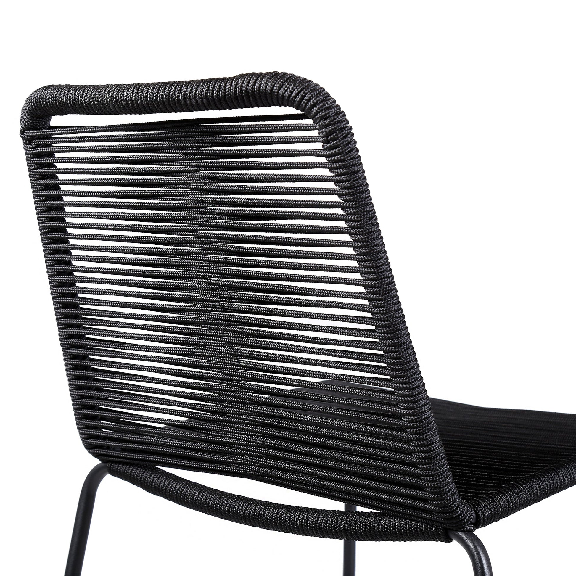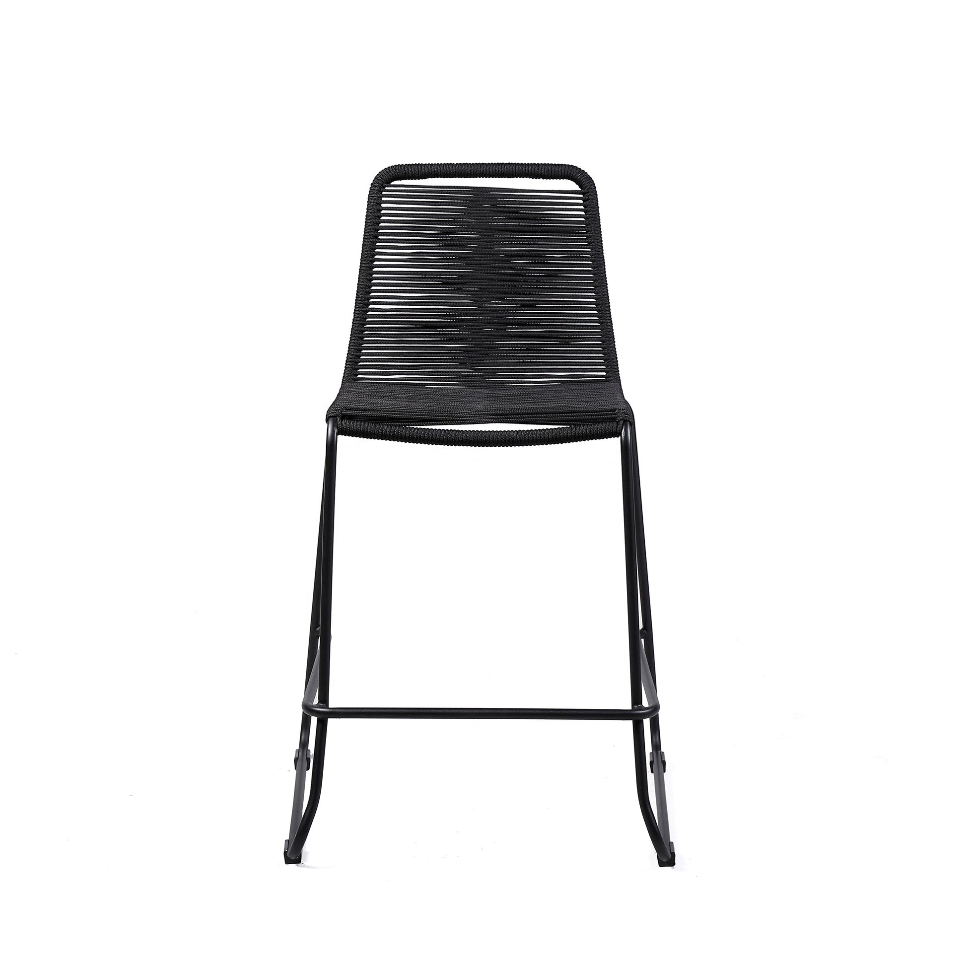 Elevate your outdoor space with this stylish set of two stackable barstools, perfect for any contemporary patio bar or seating arrangement. Crafted with a robust black powder-coated steel frame, these stools are designed for durability and long-lasting use, ensuring they withstand the elements while maintaining their sleek appearance. The innovative fishbone woven seat and back provide exceptional comfort and support, making them ideal for enjoying drinks or meals outdoors.