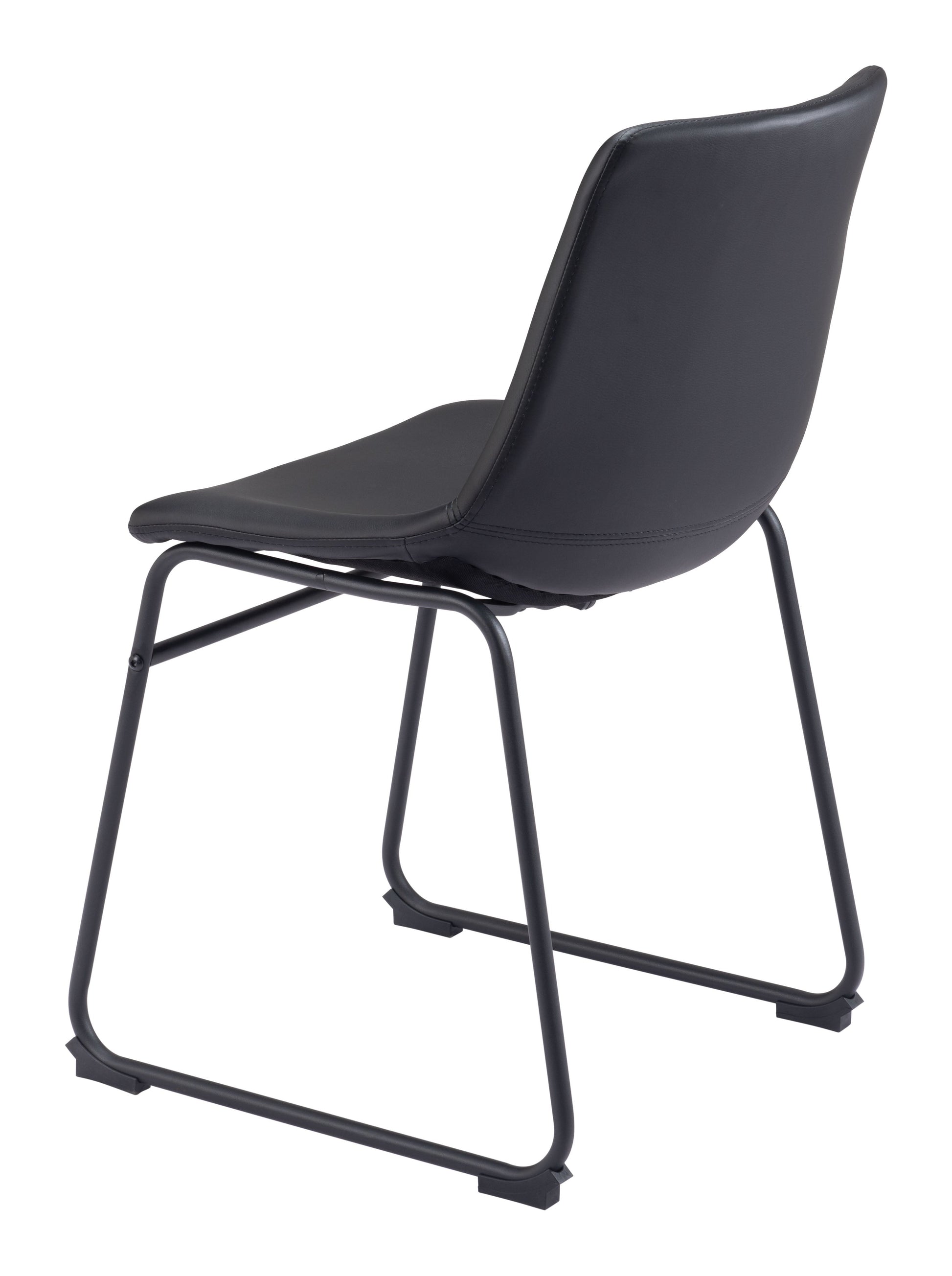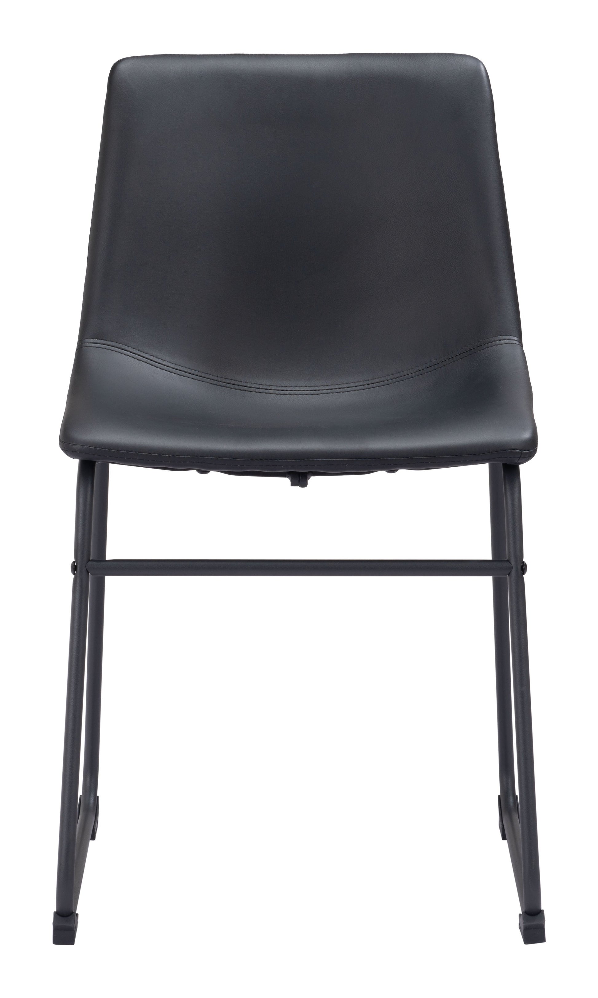 This dining chair's seat and back are built with a sculpted design for comfort. It's upholstered in a soft 100% Polyurethane fabric, with a slim profile metal base and a crossbar for stability. The frame is finished in matte black, for a universal appeal.