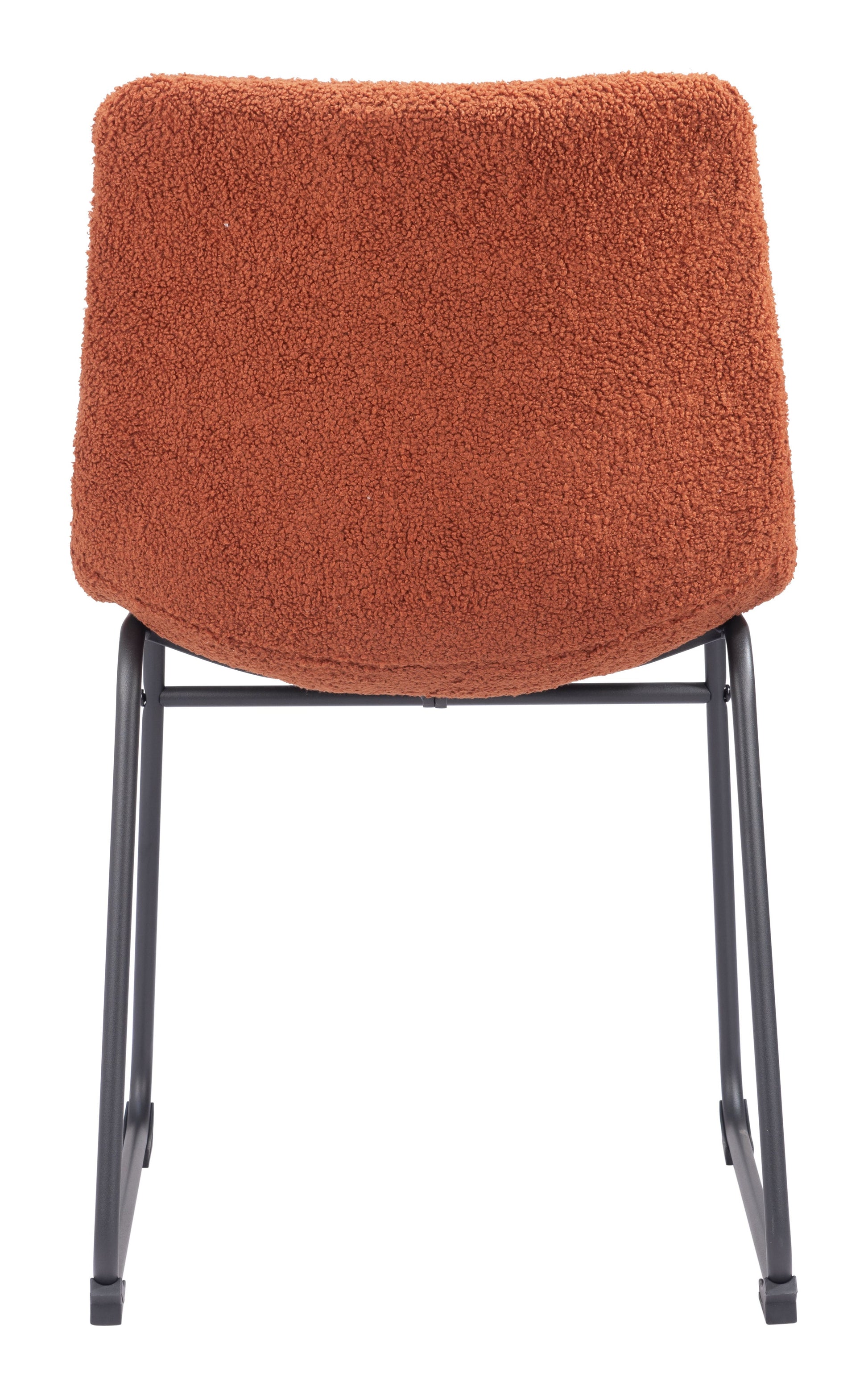 This dining chair's seat and back are built with a sculpted design for comfort. It's upholstered in a soft 100% Polyurethane fabric, with a slim profile metal base and a crossbar for stability. The frame is finished in matte black, for a universal appeal.
