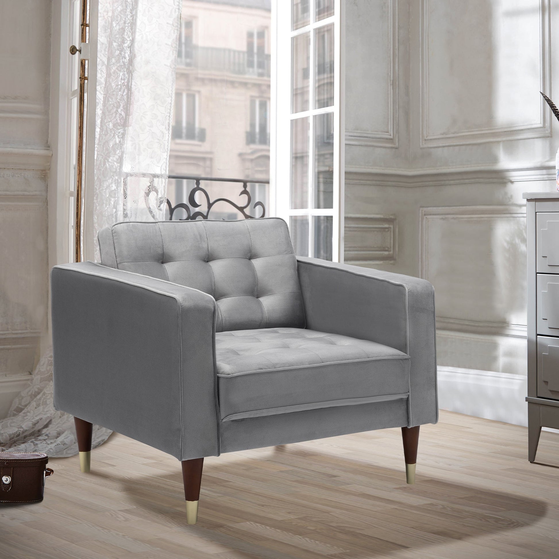 The Somerset Velvet Mid Century Modern Club Chair adds a touch of luxury to any home. Designed for elegant, comfortable living, this contemporary tufted accent chair is a classic. Its generous proportions are upholstered in sumptuous velvet with luxurious tufted detail. The gold-finished caps on its tapered wooden legs add fun retro flair. The Armen Living Somerset Velvet Mid Century Modern Collection features a sofa, loveseat and sectional sofa. This Club Chair is available in your choice of Blush or Gray velvet upholstery.