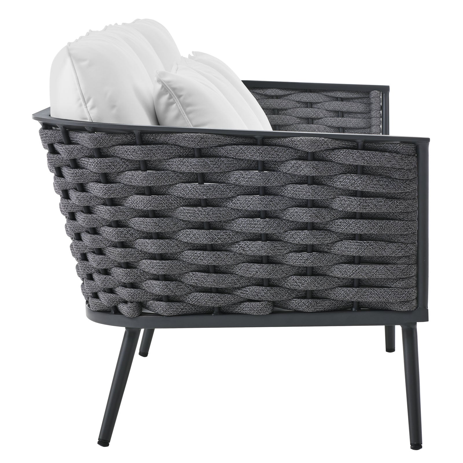 Gather family and friends for pleasant weather and good conversation with the Stance Outdoor Collection. Boasting a contemporary modern look, Stance features woven polyester fabric rope seat back and flared powder-coated aluminum frame, while waterproof all-weather fabric cushions with dense foam padding provide a relaxing spot to lounge. A versatile set designed for long-lasting durability, each piece in the Stance Collection can be mixed and matched and effortlessly arranged to fit the spontaneous needs of you and your guests. Sofa Weight Capacity: 551 lbs.