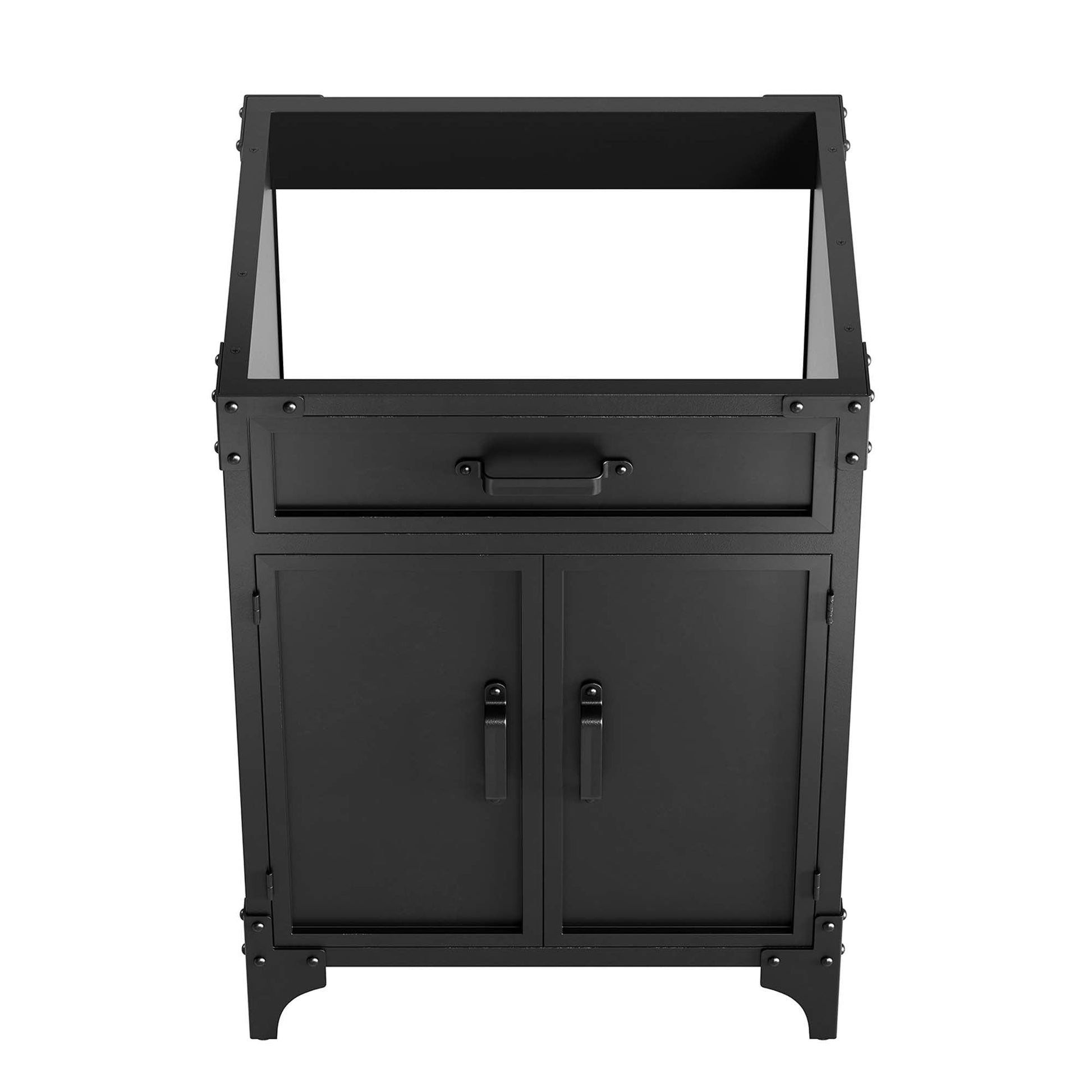 Experience the perfect blend of functionality and industrial modern style with the Steamforge 24" Bathroom Vanity Cabinet. Crafted from sturdy metal with an antique patina and MDF with a beautiful wood grain veneer, this bathroom vanity cabinet brings a touch of utilitarian elegance to your bathroom decor. With a fixed drawer, pivot hinges, and spacious shelving complete with a plumbing cutout, this vanity provides ample storage space for all your bathroom essentials. With non-marking foot pads to protect your flooring, this bathroom vanity offers the ideal balance of design and practicality. Sink basin and fixtures not included. Overall Product Dimensions: 18"L x 23"W x 33"H