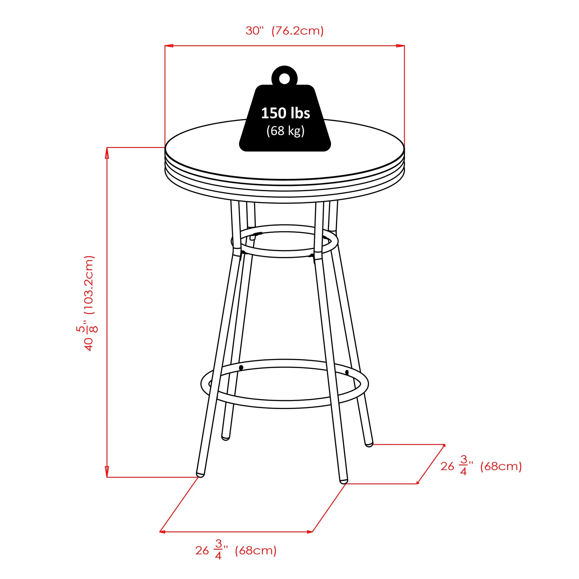 Give your home a new look with the Winsome Wood Summit 3-piece Pub Table set. A stunning blend of modern and retro. Compact yet still sophisticated style of this set makes it a great addition to any area; ideal for dining or social gatherings. The pub table top is constructed of a smooth, sturdy wood composite tabletop in black, with a diameter of 30”, ample space to have a meal or snack. With a chrome plated finish frame and ring design that complements the legs that have a 26.77” foot print. The metal ring connecting to all four legs toward the bottom, sits up 10.59” from the ground, this helps provide stability to the structure of the table, while adding support to rest your feet while having a drink or playing cards with your friends. Sitting up at 40.61” high, sit comfortably with the matching pair of Summit swivel bar stools. Just like the table, the stools also have same chrome bottom and black top. The trendy 29.1” high stools, have a cushioned 13.78” diameter black PVC seat that swivel up to 360-degress for extra utility. And just like the table, the stools have a foot bar providing that additional comfort, making it a great study table for a dorm room or a nice addition for the game room or in-home bar. This 3-piece set is shipped in 2 boxes, each includes the hardware necessary for assembling. Replacement part request can be submitted directly to the manufacturer within 60 days from date of purchase.Dimensions : 30 in. Wide 30 in. Deep 40.61 in. High