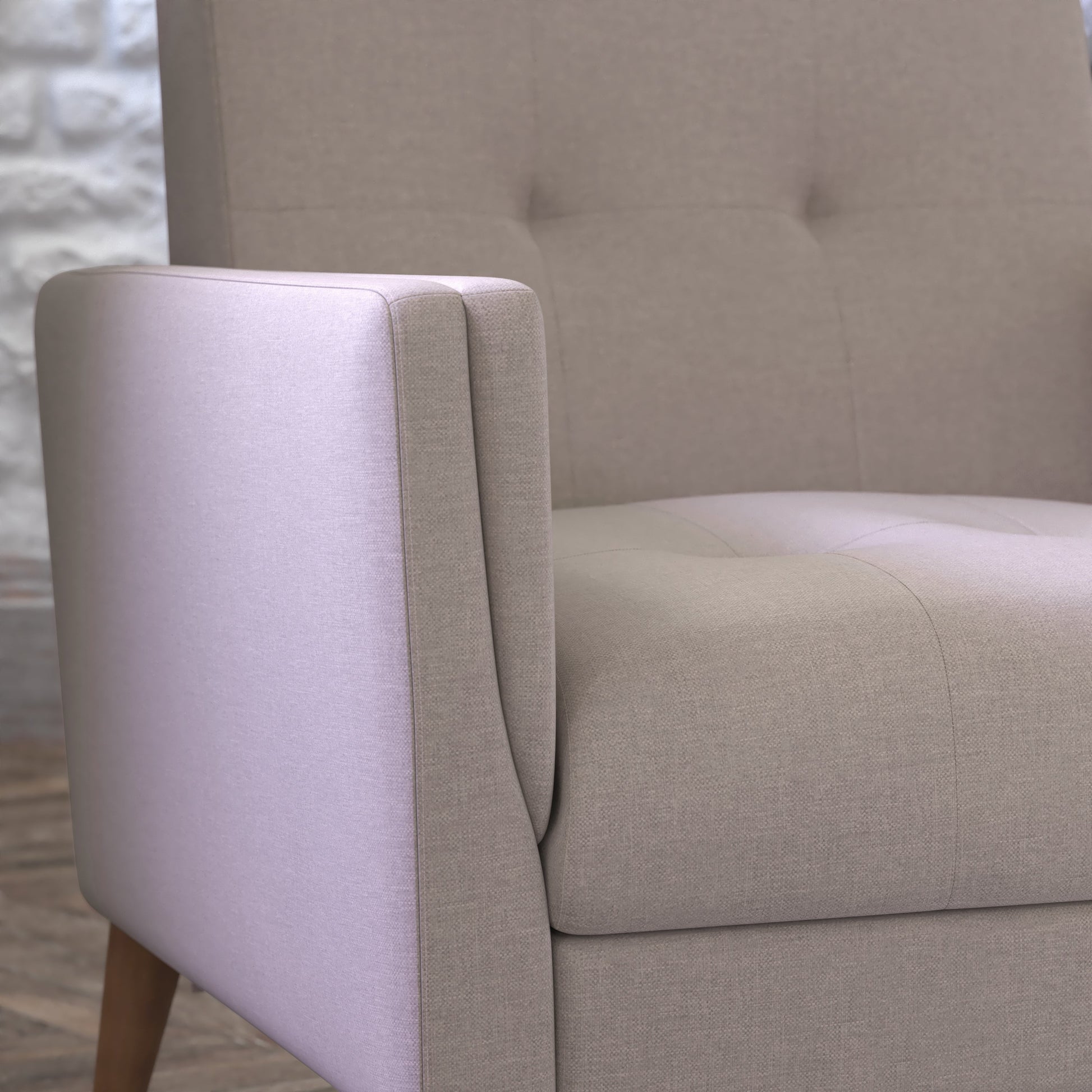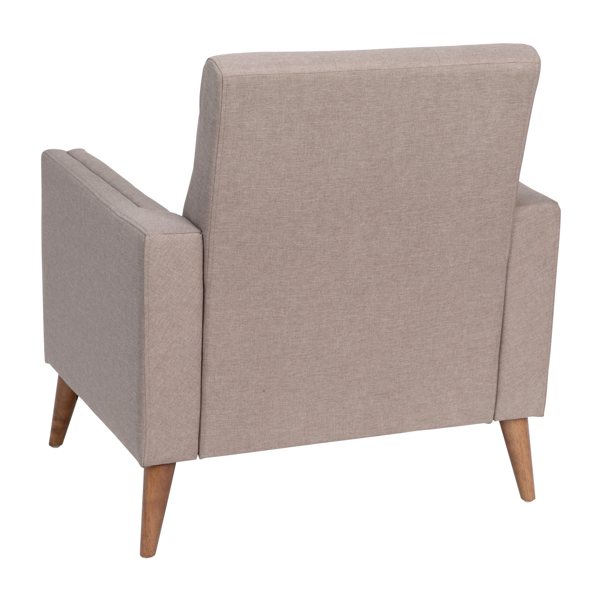 Conrad Mid-Century Modern Commercial Grade Armchair with Tufted Faux Linen Upholstery & Solid Wood Legs in Taupe Dimensions: 30.25"W x 30"D x 31.5"H