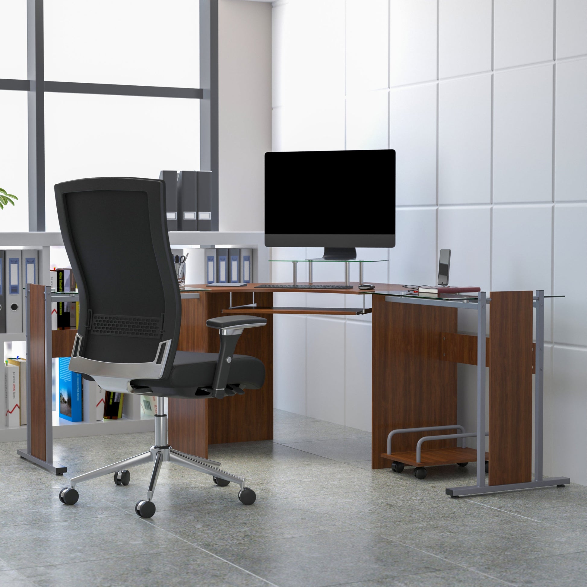 Singleton Teakwood Laminate Corner Desk with Pull-Out Keyboard Tray and CPU Cart Dimensions: 95"W x 61.75"D x 34"H