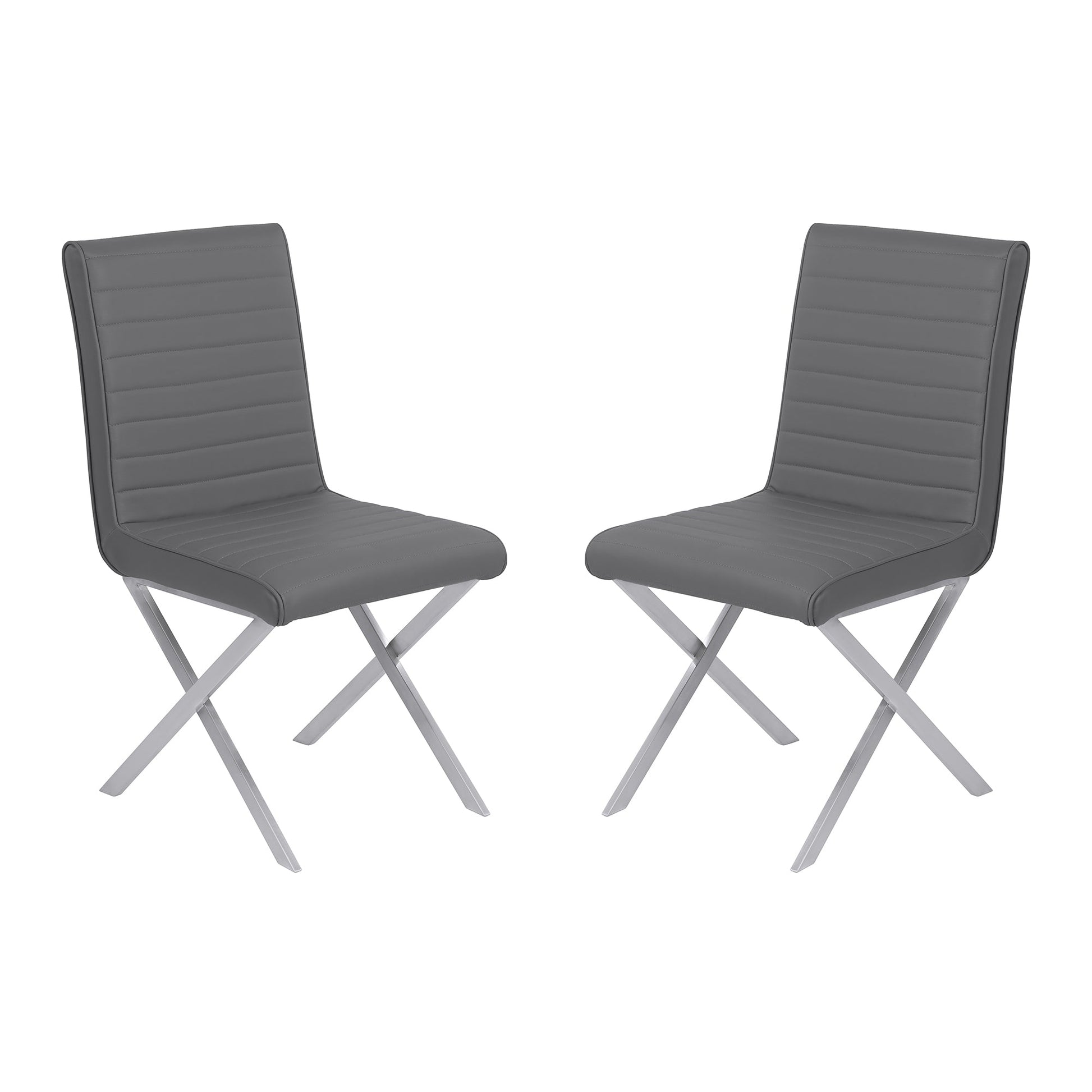The Armen Living Tempe contemporary dining chair is both stylish and practical, a perfect addition for any modern home. The durable brushed stainless steel cross-legs are expertly designed to be both aesthetically pleasing and complimentary to the plush faux leather upholstered seat. The design of this piece allows it not only to function in the dining room, but in every other room in the house as well. The Tempe is sold in a set of two and is available in three stylish colors; Gray, black, and white.