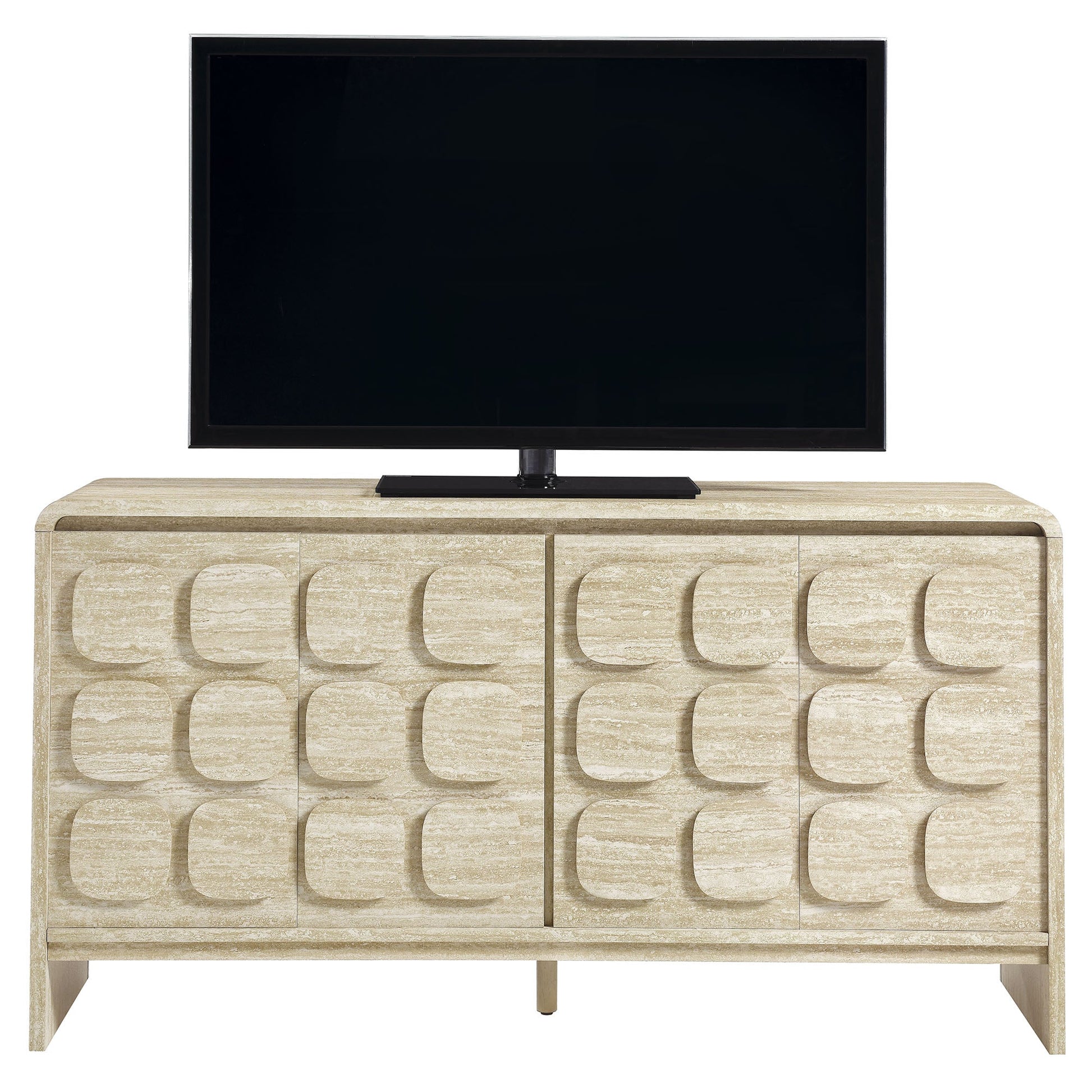 Elevate your living or working space with the Toscana 61'' Mid Century Modern Sideboard featuring rounded corners and a circular pattern motif across the face of the cabinet. This elegant buffet cabinet features a premium laminate finish for a sleek, contemporary design that upgrades any space. Perfect for the dining room, living room, or office, this storage cabinet combines style and functionality. Behind its four soft-close hinged doors, find two spacious storage areas in this credenza cabinet, each equipped with an adjustable shelf to accommodate your needs. Non-marking floor glides keep floors pristine. Whether you use it as a dining room sideboard or media cabinet with doors, its versatile design makes it an excellent choice for any setting. Capable of supporting wall-mounted TVs up to 68 inches, Toscana is an ideal tv media console or entertainment stand. Transform your space with this modern storage cabinet that brings a touch of mid-century elegance to your home. Assembly required. Overall Product Dimensions: 17.7"L x 60.7"W x 32.4"H