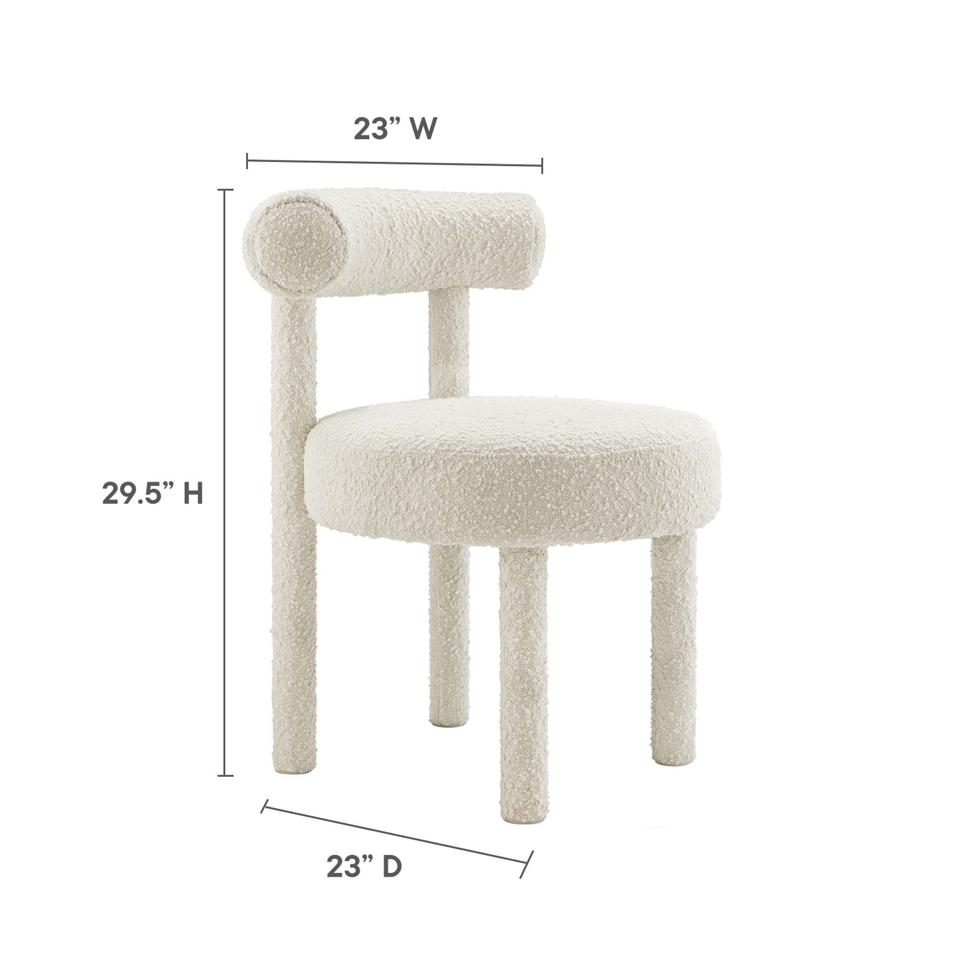 Enhance your space with the exquisite Toulouse Boucle Upholstered Dining Chair. This unique piece combines dining chair functionality with accent chair elegance. Upholstered in beautifully textured boucle fabric, this dining chair exudes modern luxury and glam deco style. The curved bolster pillow backrest, circular seat, and dense foam padding provide unparalleled comfort and unmatched aesthetics. With non-marking foot pads to protect your flooring, this boucle dining chair adds a touch of sophistication to any room. Weight Limit: 330 lbs. Overall Product Dimensions: 23"L x 23"W x 29.5"H