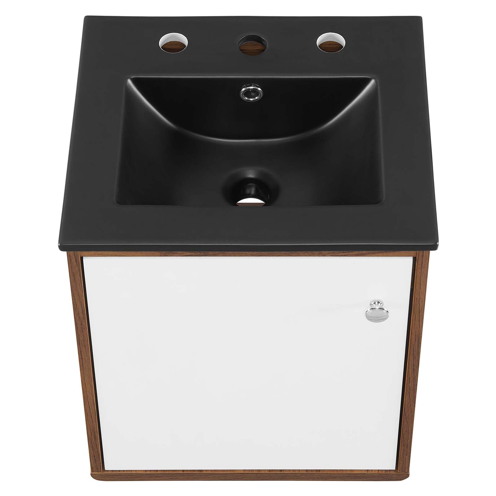 Bring mid-century modern aesthetics into the bathroom with the Transmit 18" Bathroom Vanity. This vanity features a durable particleboard and walnut grain veneer construction with ample storage space for all your bathroom essentials behind a white lacquered soft-close hinged door. A ceramic sink with an integrated countertop, 8" centerset faucet holes, and rectangular sink basin continues the sleek look of this retro modern vanity. Complete with chrome knobs, this bathroom vanity mounts directly to the wall saving a substantial amount of floor space. Assembly required and sink fixtures not included.