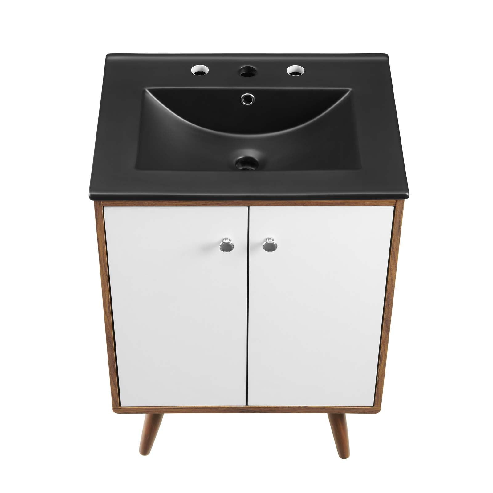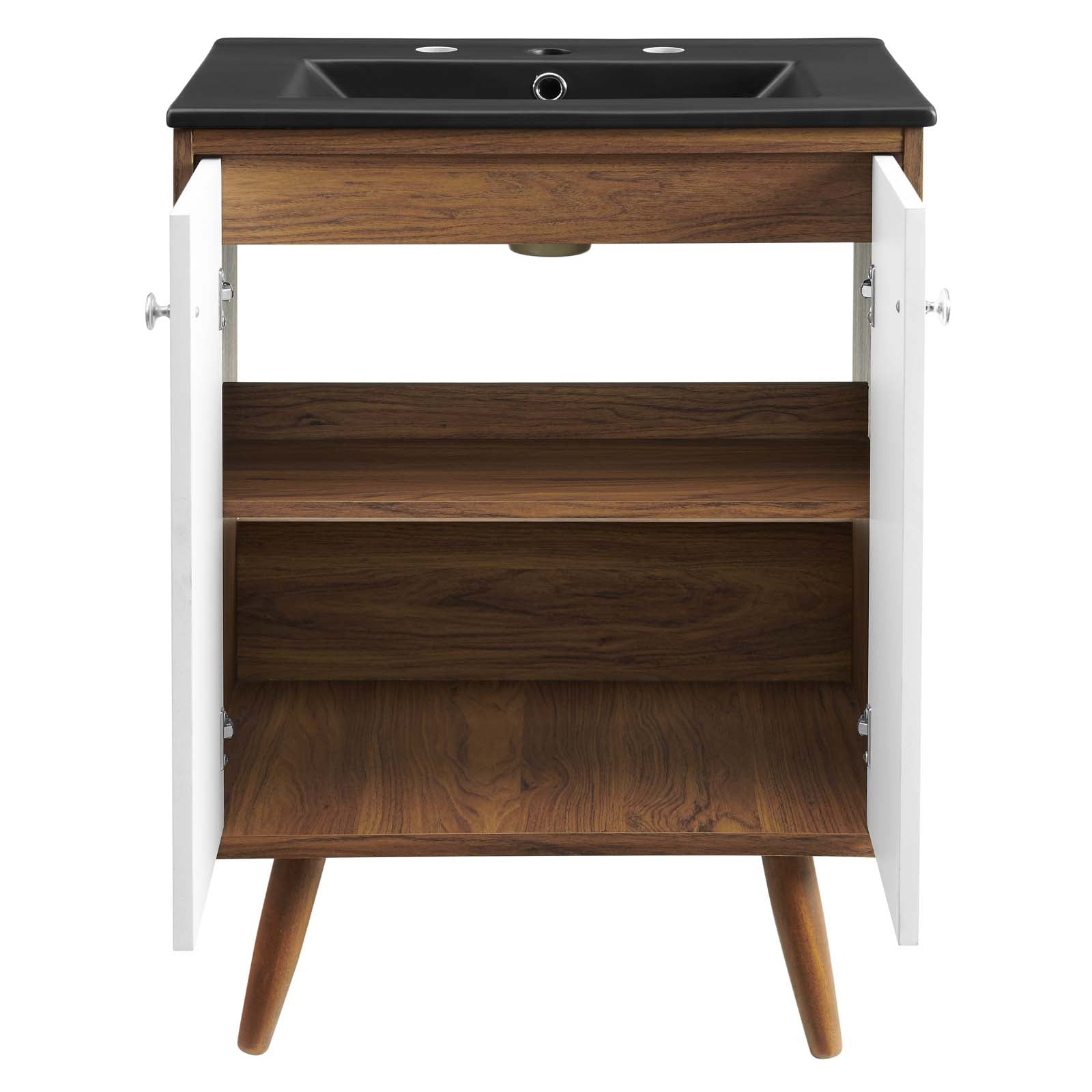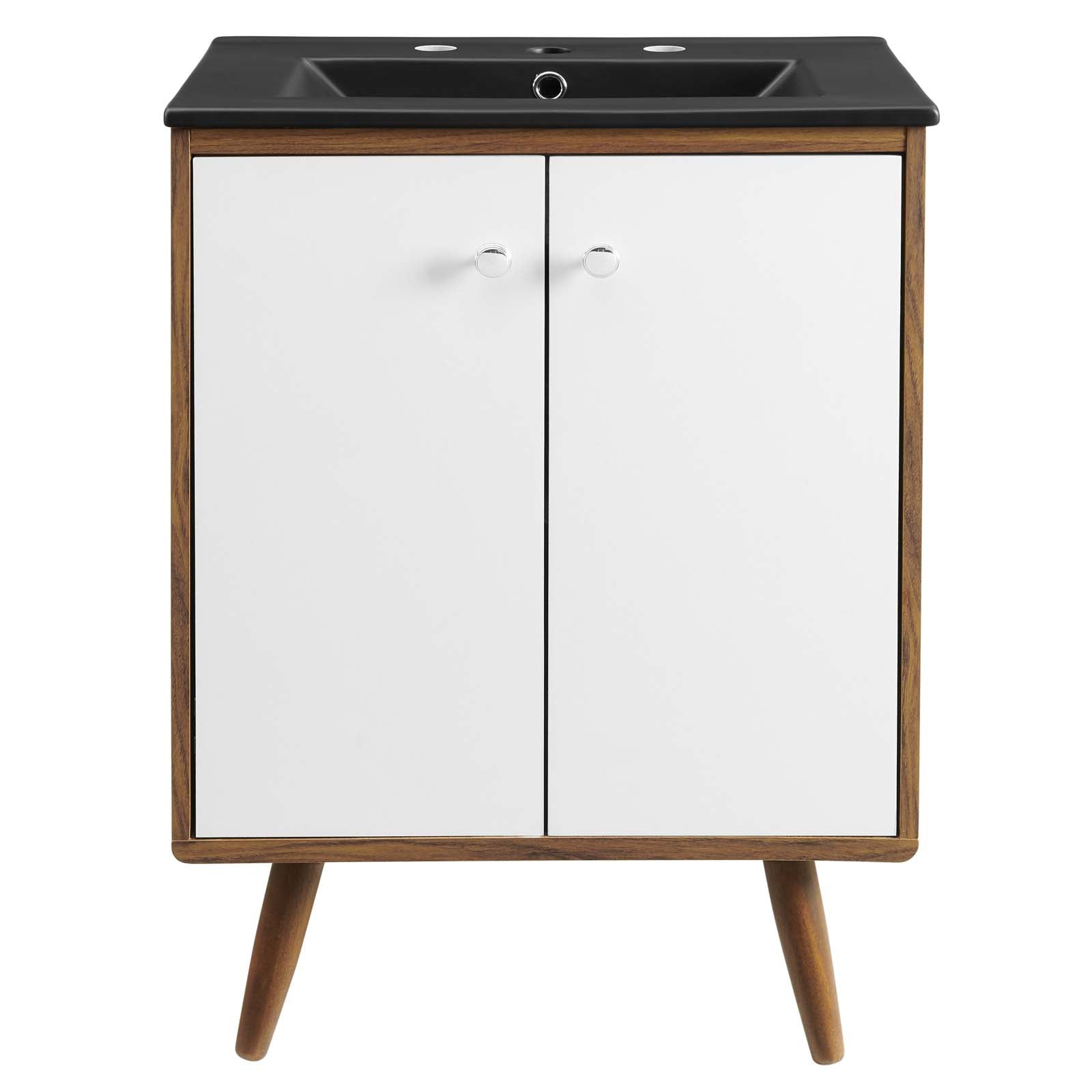Bring mid-century modern aesthetics into the bathroom with the Transmit 24" Bathroom Vanity. This vanity features a durable particleboard and walnut grain veneer construction with ample storage space for all your bathroom essentials behind two white lacquered soft-close hinged doors. A ceramic sink with an integrated countertop, 8" centerset faucet holes, and rectangular sink basin continues the sleek look of this retro modern vanity. Complete with chrome knobs, this bathroom vanity rests atop four splayed wood legs. Assembly required and sink fixtures not included.
