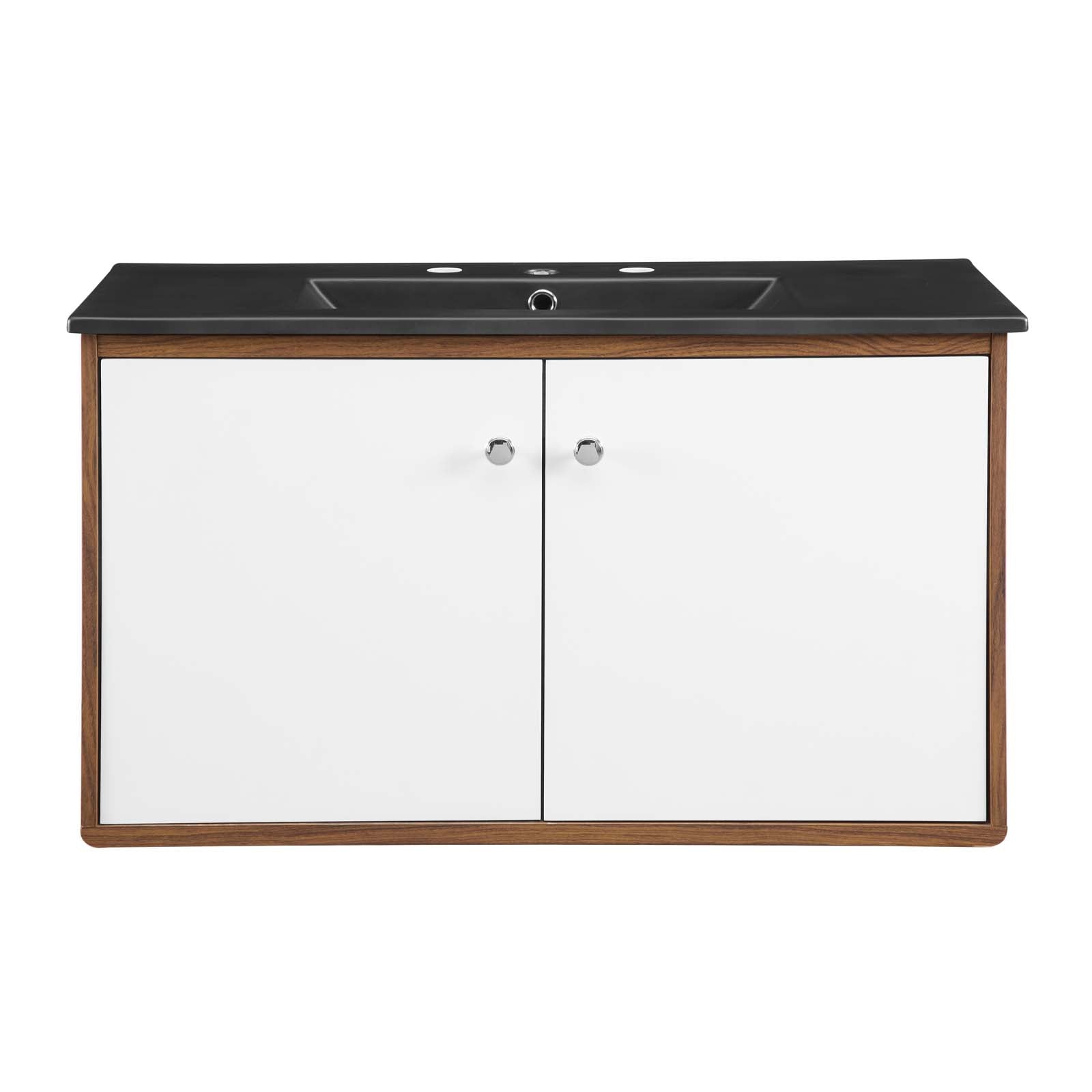 Bring mid-century modern aesthetics into the bathroom with the Transmit 36" Bathroom Vanity. This vanity features a durable particleboard and walnut grain veneer construction with ample storage space for all your bathroom essentials behind two white lacquered soft-close hinged doors. A ceramic sink with an integrated countertop, 8" centerset faucet holes, and rectangular sink basin continues the sleek look of this retro modern vanity. Complete with chrome knobs, this bathroom vanity mounts directly to the wall saving a substantial amount of floor space. Assembly required and sink fixtures not included.