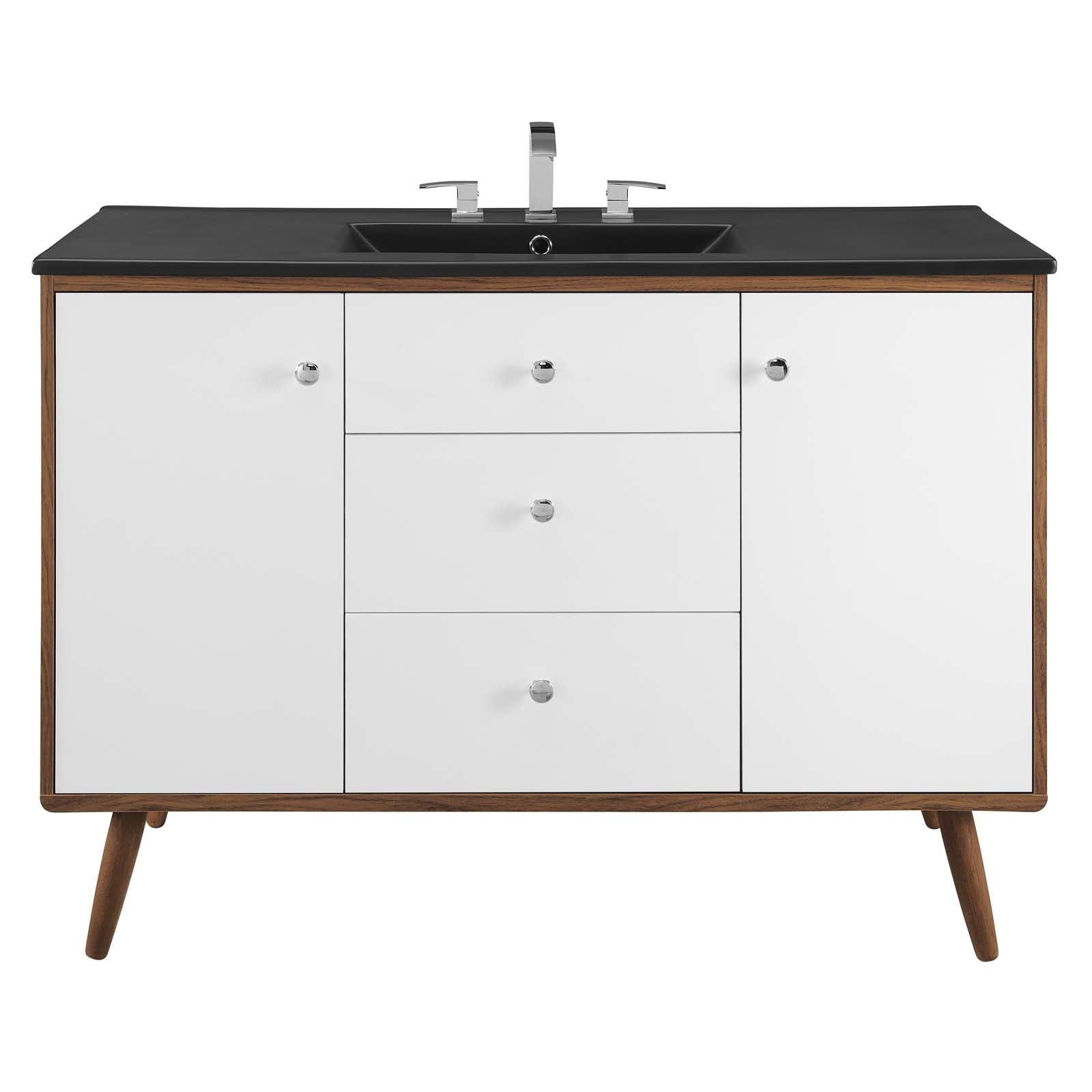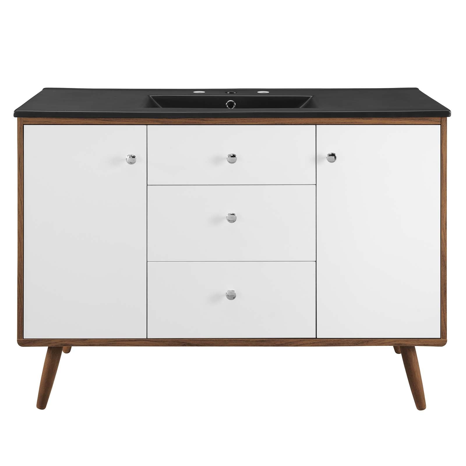 Bring mid-century modern aesthetics into the bathroom with the Transmit 48" Bathroom Vanity. This vanity features a durable particleboard and walnut grain veneer construction with ample storage space for all your bathroom essentials behind two white lacquered soft-close hinged doors and two full-extension drawers with a fixed center drawer. A ceramic sink with an integrated countertop, 8" centerset faucet holes, and rectangular sink basin continues the sleek look of this retro modern vanity. Complete with chrome knobs, this bathroom vanity rests atop four splayed wood legs. Assembly required and sink fixtures not included.