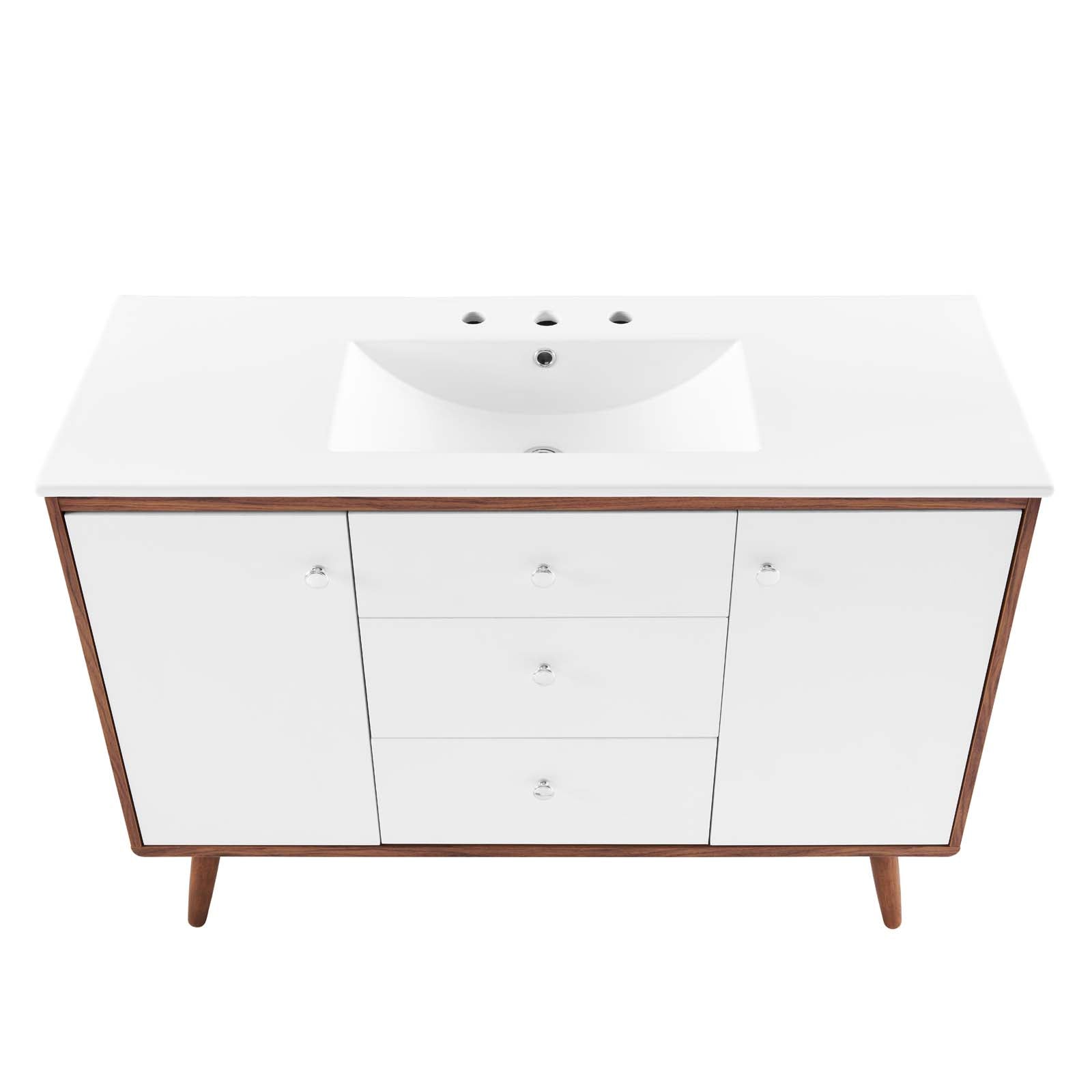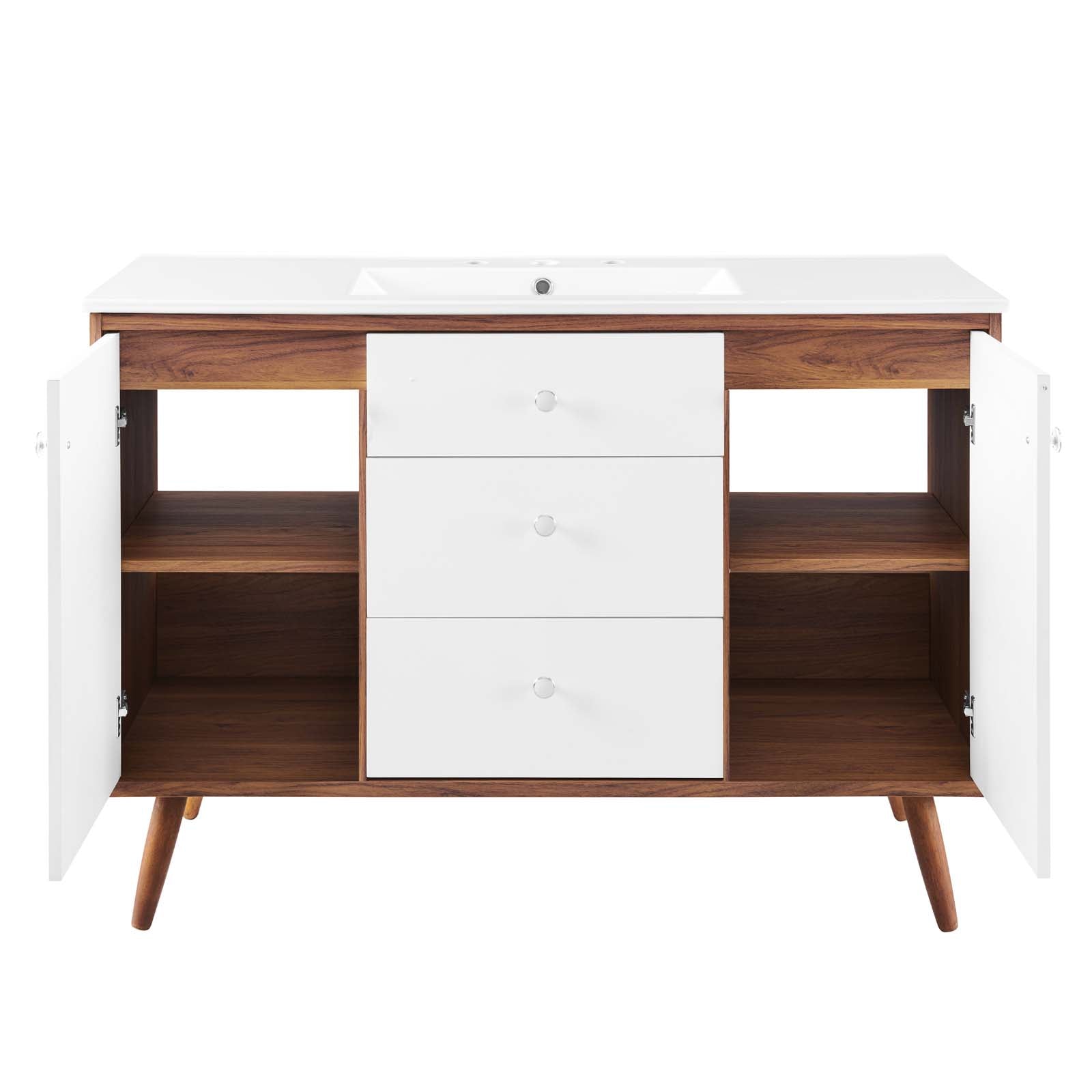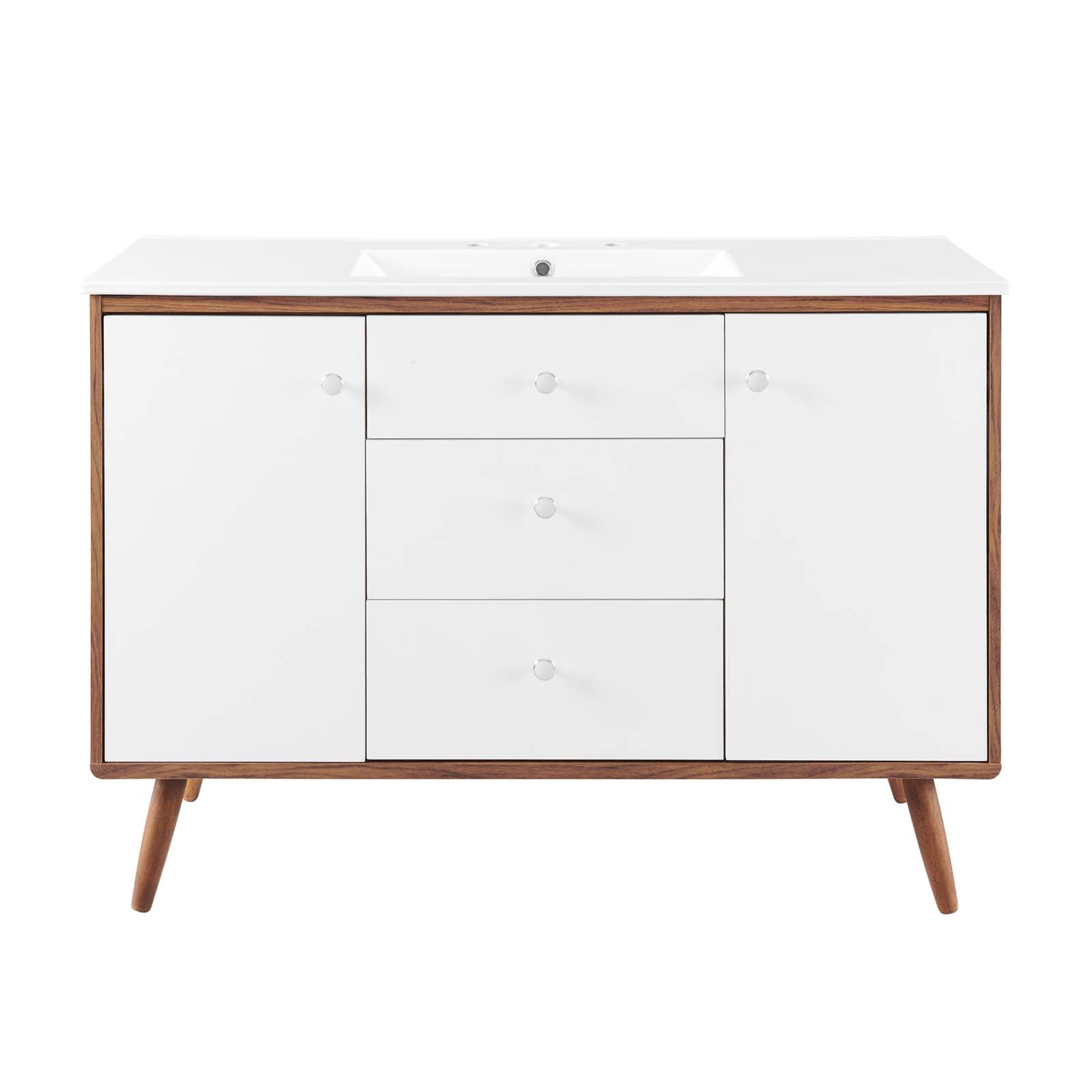 Bring mid-century modern aesthetics into the bathroom with the Transmit 48" Bathroom Vanity. This vanity features a durable particleboard and walnut grain veneer construction with ample storage space for all your bathroom essentials behind two white lacquered soft-close hinged doors and two full-extension drawers with a fixed center drawer. A ceramic sink with an integrated countertop, 8" centerset, and rectangular sink basin continue the sleek look of this retro modern vanity. Complete with chrome knobs, this bathroom vanity rests atop four splayed wood legs. Assembly required and sink fixtures not included.